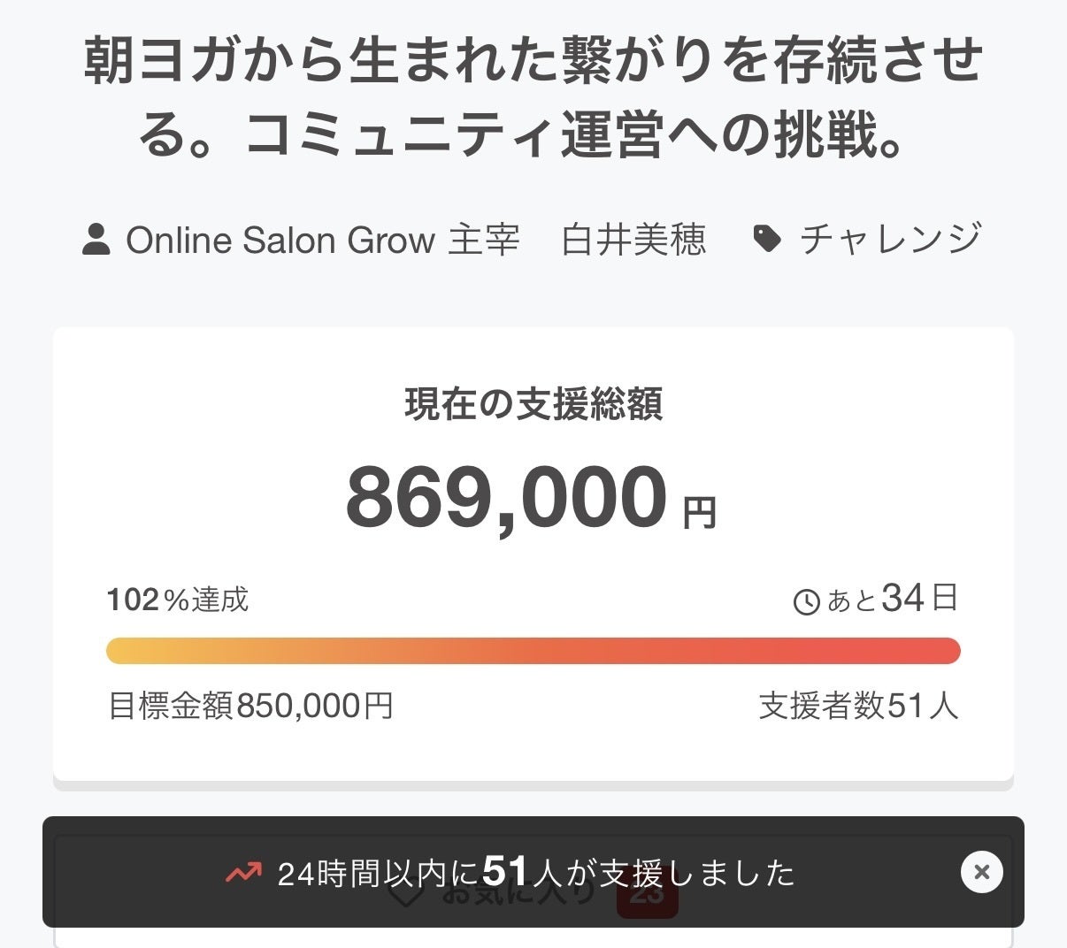 驚きを隠せないほどのスピードで19時間後には目標としていた85万円のゴールに到達することができました。本当にありがとうございます。
