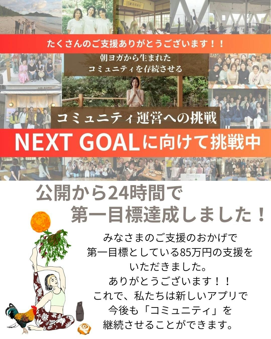 私たちのこの第一目標「85万円」で達成させたかったことは、作り上げてきたコミュニティを守ること。無事にみなさまのおかげで、アプリという形で場を変えてヨガの習慣から生まれた人とのつながりを存続させることができます。まずはここまで来れたことに、正直ほっとしています。
