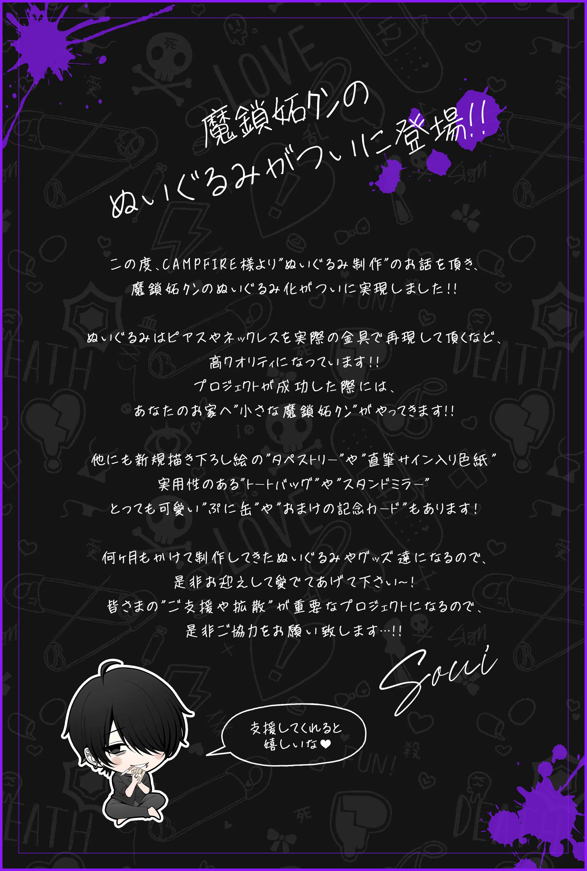 イラストレーターの満身ソウイが描く「魔鎖妬クン」がぬいぐるみ化に挑戦します!