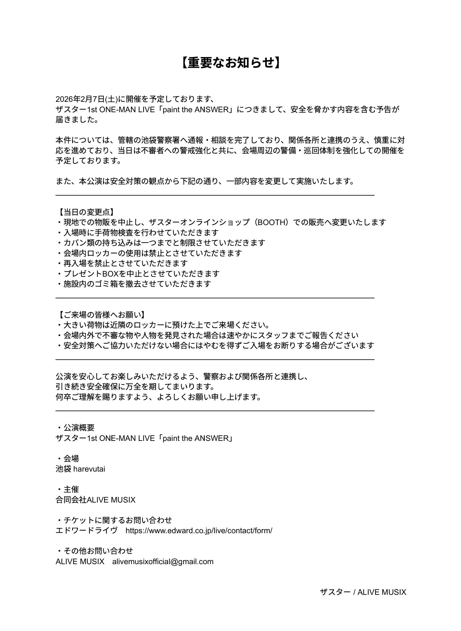 公演内容変更および安全対策について