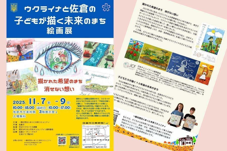 40作品、「10年後の未来のまち」を描いたウクライナと佐倉市の10歳から15歳の子どもの作品を20作品程度の合計60作品程度を展示します。