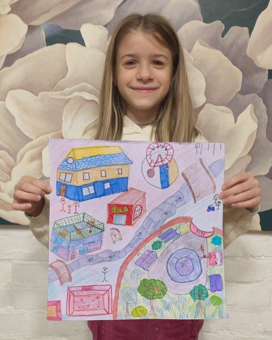 「私の未来のまちでは、川沿いに散歩道があり、水の中をたくさんの魚が泳いでいます。観覧車や屋上に運動場のある学校、公園やアイスクリーム屋さんもたくさん。建物は青と黄色に彩られ、みんなが笑顔で幸せに暮らすまちです。」― ステファーニャ・セリュック(10歳)