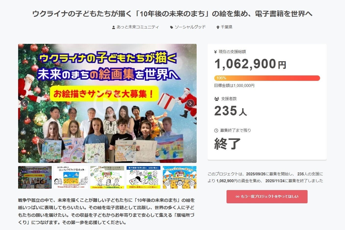 この度は、「ウクライナの子どもたちが描く 10年後の未来のまち 絵画集電子書籍プロジェクト」に熱いご支援、そして温かい応援を賜り、心より感謝申し上げます。