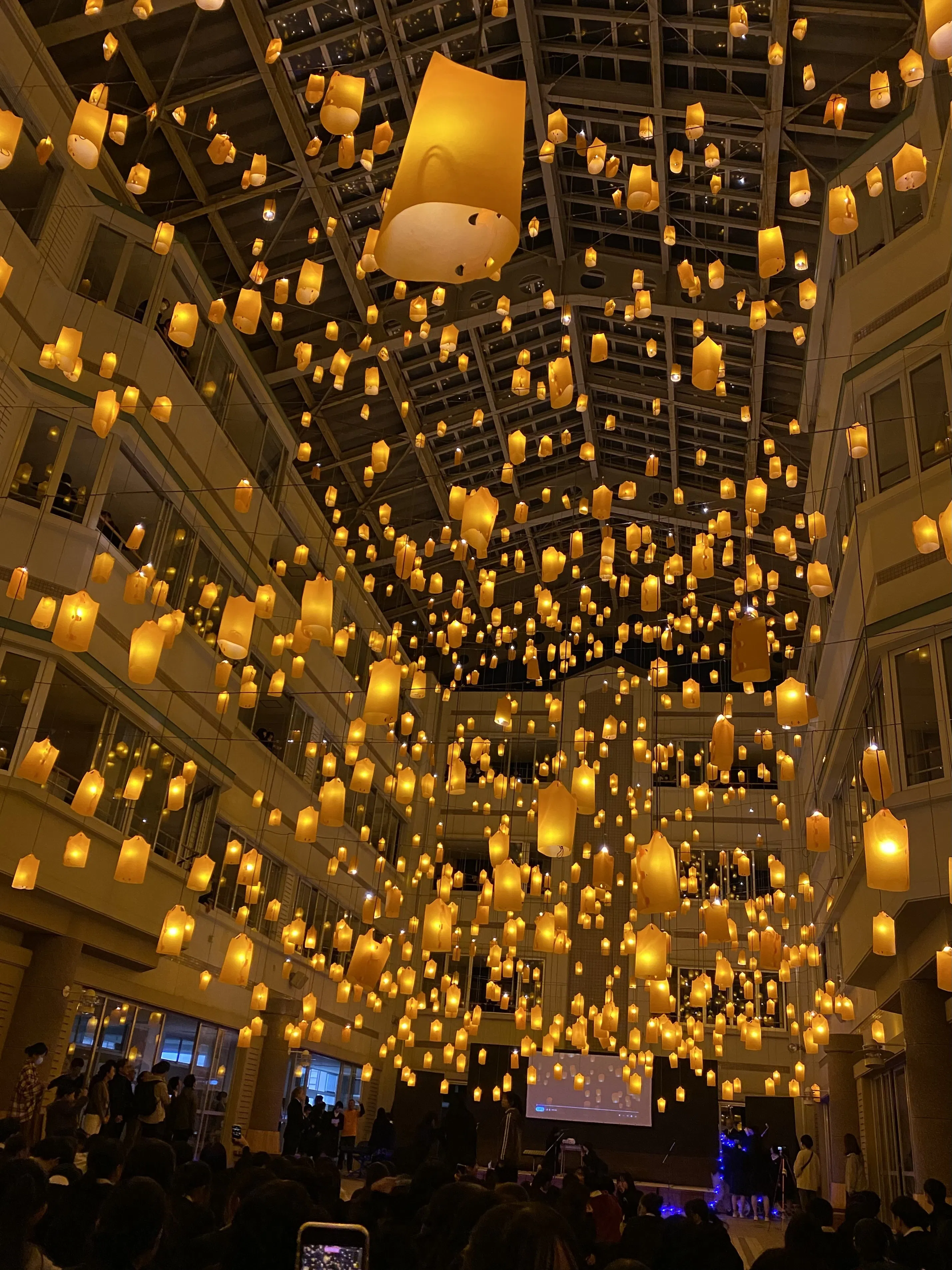 本物のスカイランタンをここで飛ばすことは出来ませんが、ランタンの形状で点灯するものを飾り、二水高校の生徒さん達に感動して貰いたいな、と考えました。