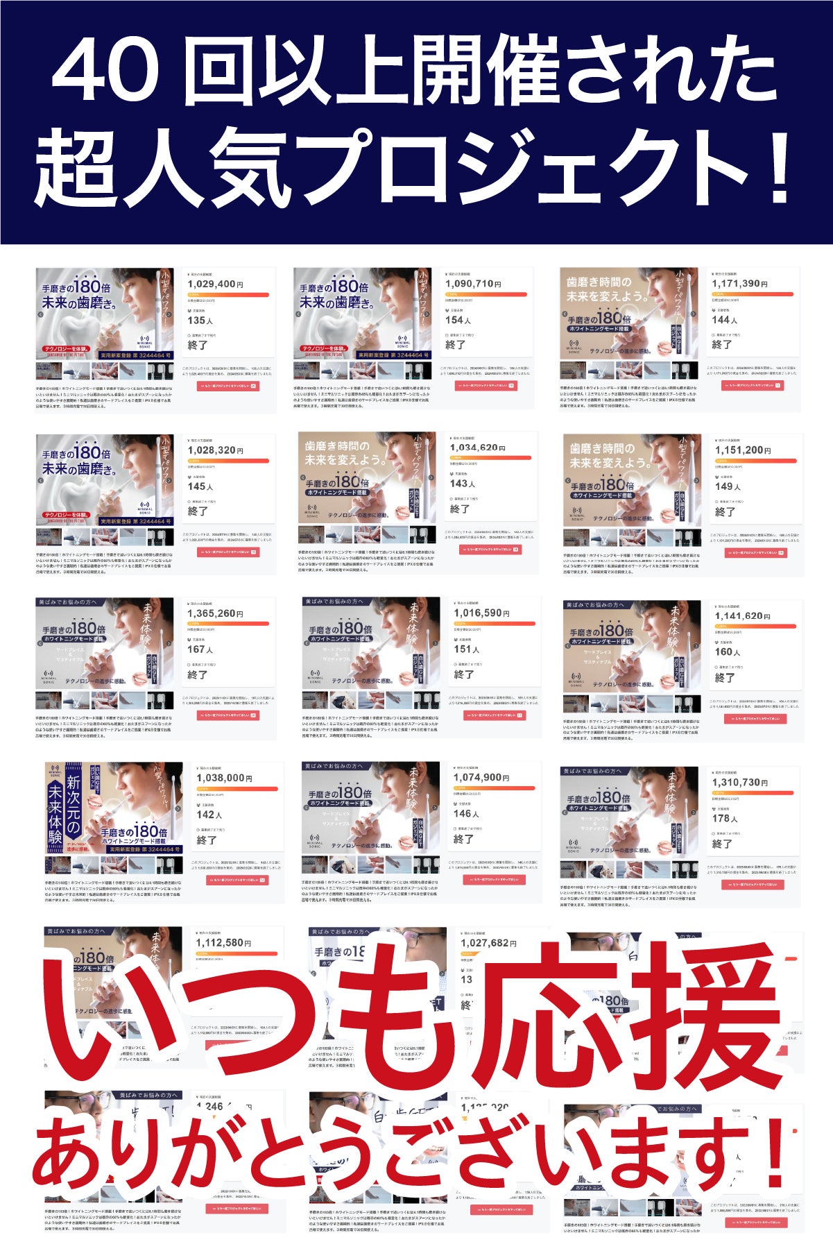 2026/02/14 20:00日頃より、多くのご支援ありがとうございます。「替えブラシ」のリターンを販売しておりますので、ご案内させて頂きます。<こちらで開催中>https://camp-fire.jp/projects/914025/view(※ミニマルソニック2本目のご購入もオススメです。)この機会に是非、ご利用下さいませ。引き続き、ミニマルソニックをどうぞよろしくお願い申し上げます。ミニマルトゥースラボスタッフ一同 もっと見る【替えブラシ】リターン販売中のご案内