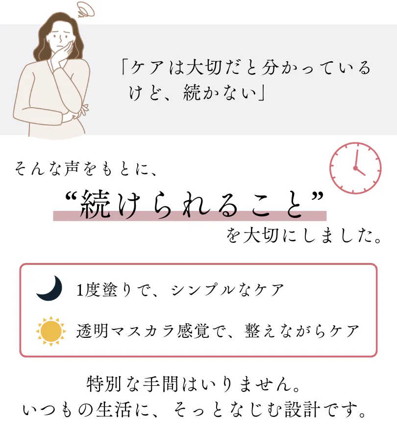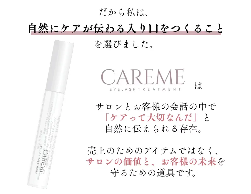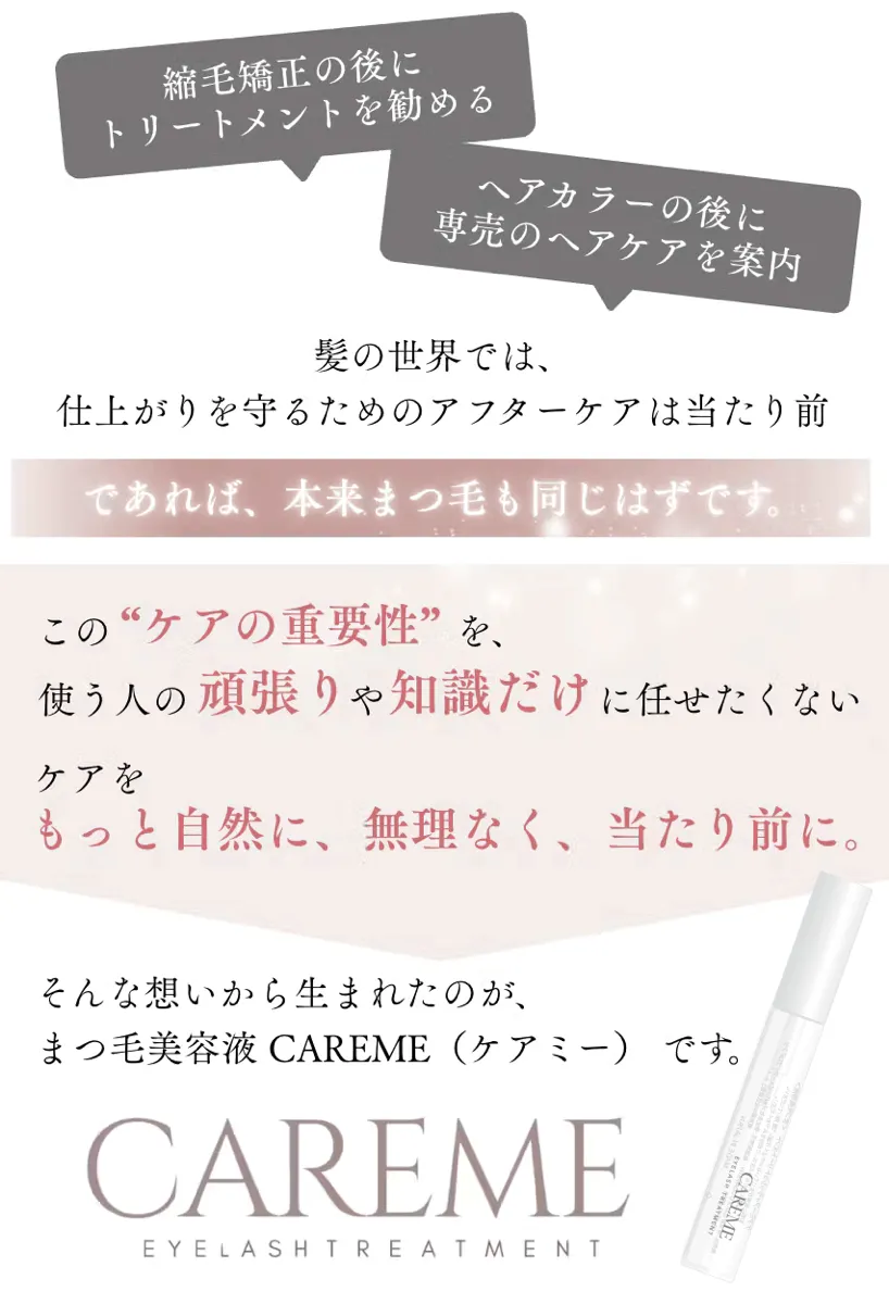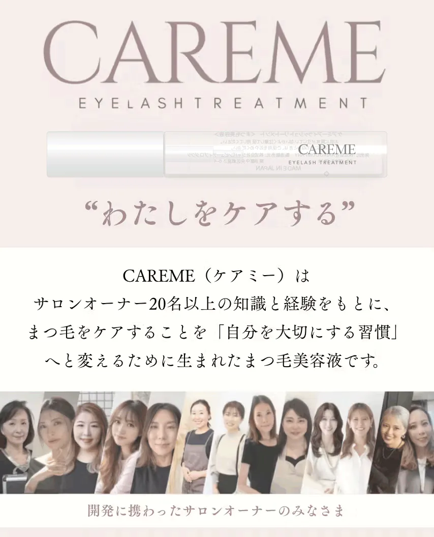 CAREMEは、まつ毛だけでなく、日々忙しく過ごす女性の気持ちにも寄り添う美容液です。