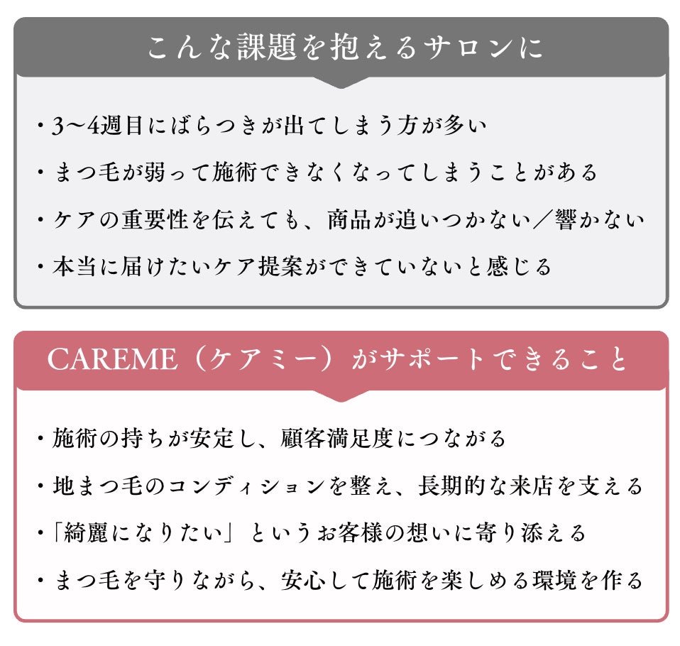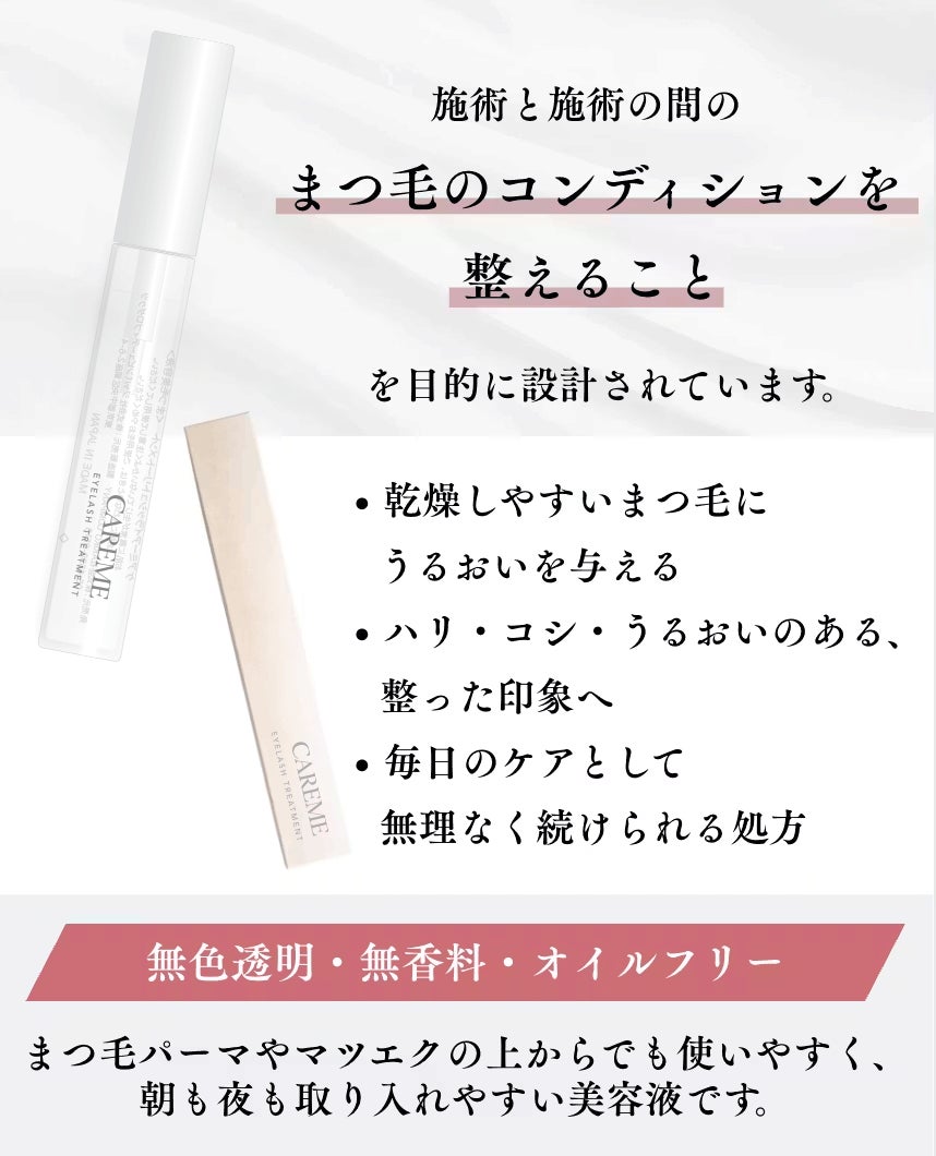 CAREMEは、まつ毛だけでなく、日々忙しく過ごす女性の気持ちにも寄り添う美容液です。