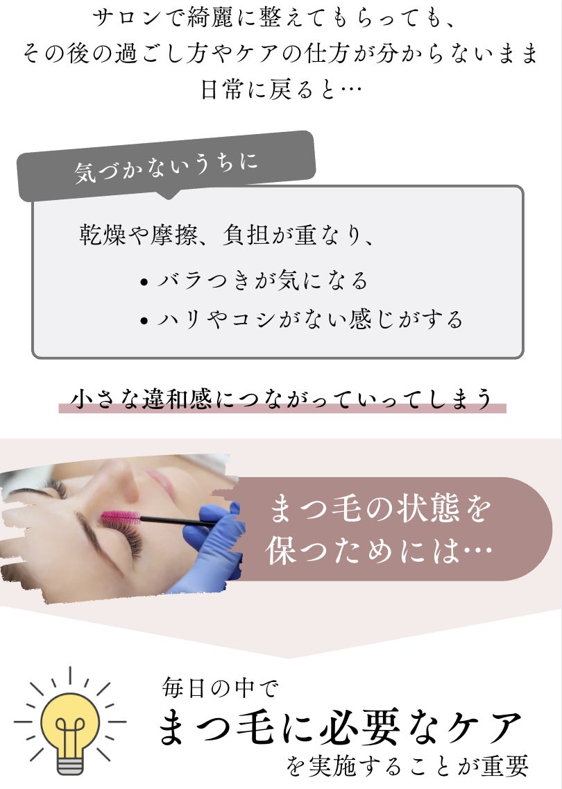 A. 個人差はありますが、1ヶ月程度の継続使用でまつ毛のばらつきや乾燥が気になりにくくなったというお声をいただいています。あくまでまつ毛を健康に整えることを目的としたアイテムのため、即時的な効果よりも日々のケアの積み重ねが大切です。