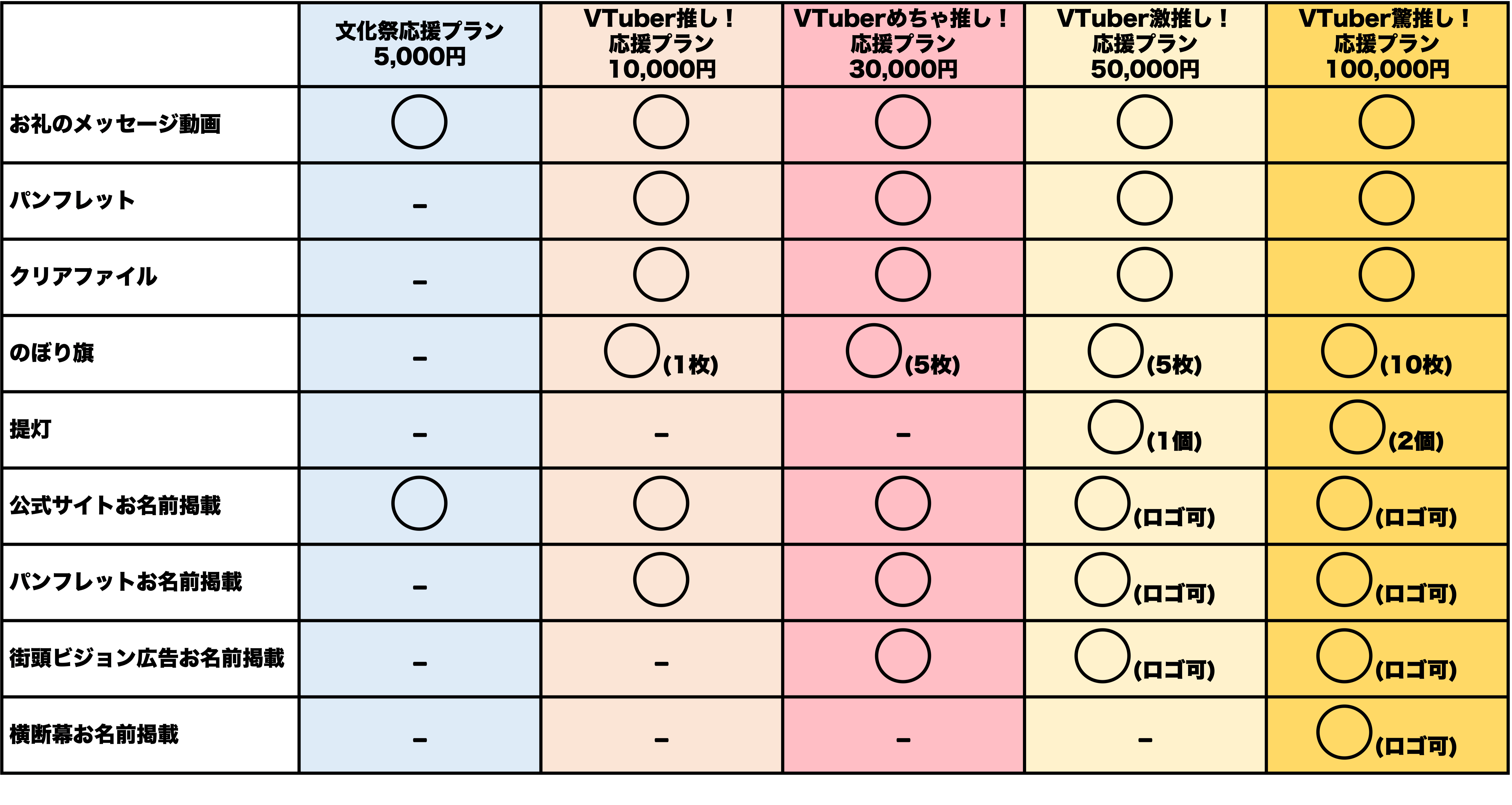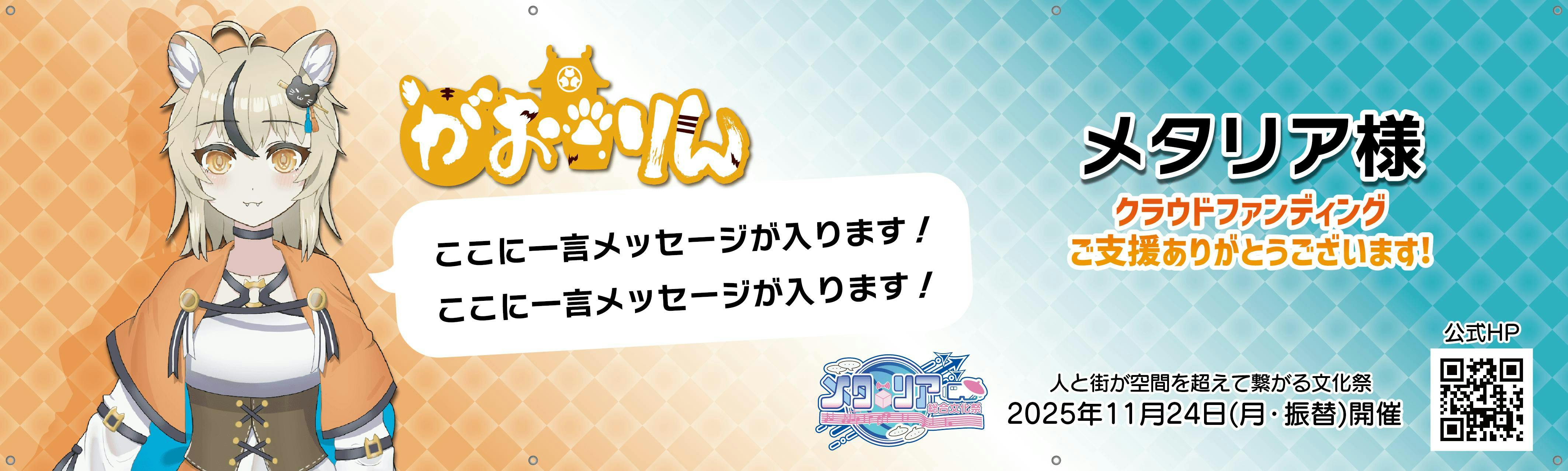 2025/09/16 19:58いつもメタリア総合文化祭を応援していただき誠にありがとうございます。ご支援プラン及びリターンについて以下の通りお知らせいたします。横断幕プランを含むプラン比較表全員のぼり旗への変更についてのぼり旗がリターンに含まれるプランでご支援いただいている方は、お選びいただいているデザインを全員デザインの旗へ変更が可能です。他のデザインへの変更はできませんのでご了承ください。横断幕プランへの変更について10万円のプランを既にご支援いただいている方は、横断幕プランへの変更が可能です。「VTuber驚推し!プラン」から「横断幕掲げちゃう!プラン」への変更はリターンの内容が変わりますのでご注意ください。支援総額に応じたプラン変更について複数回ご支援をいただいている方の支援総額に応じたプランの変更はできません。各種変更のお問い合わせについてリターンとプランの変更については、CAMPFIRE内にあるメッセージ機能よりお問い合わせください。その他、クラウドファンディングやメタリア総合文化祭に関する内容のお問い合わせは、CAMPFIRE内にあるメッセージ機能、公式XのDM、メール:info@metareafes.comまでお問い合わせください。スタッフや出演者などへのお問い合わせは、ご返答致しかねますのでご遠慮ください。 もっと見る