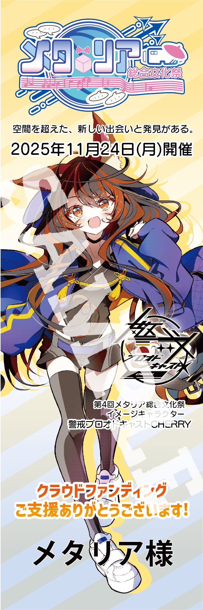 2025/10/13 22:23※9月5日〜16日のご支援報告について、各日の投稿を行うと投稿ごとに皆様にメールが送信されてしまいますので、こちらにまとめて投稿させて頂きますので、ご了承ください。警戒ブロオドキャストCHERRYリンコナ 岩桐ゆかな蓮桜みこねがおりん瀬戸兎ゆめ高ノ瀬凛せきまる全員デザイン1ヶ月間のクラウドファンディングにおいて、多くのご支援を賜りまして、誠にありがとうございました。11月24日の「第4回メタリア総合文化祭」に向けて準備を進めておりますので、引き続き応援のほど、何卒よろしくお願いいたします。 もっと見るリターン・プラン変更とお問い合わせ方法について