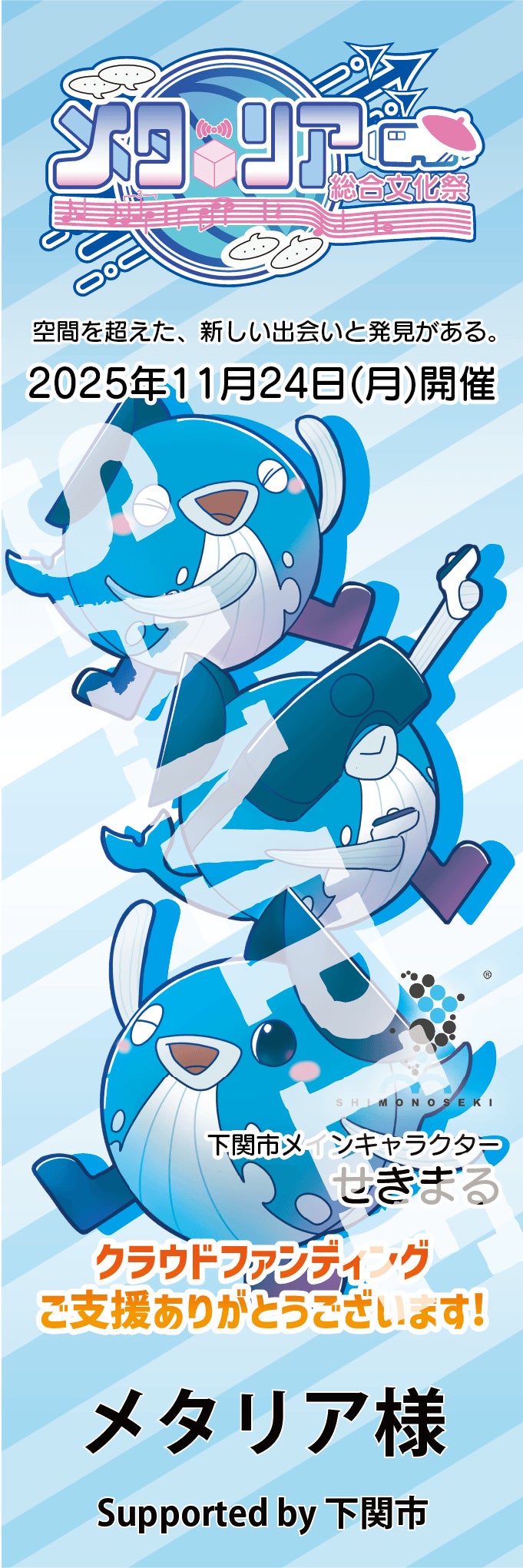 あまりサブカル系の催し物がない下関の街をみなさまのご支援で活気ある姿に彩りたいと思います!のぼり旗はVTuber9種類+下関市公式キャラクター「せきまる」1種類の9種類 計10種類、ご支援者様のお名前入りのぼり旗を駅前などに設置します。
