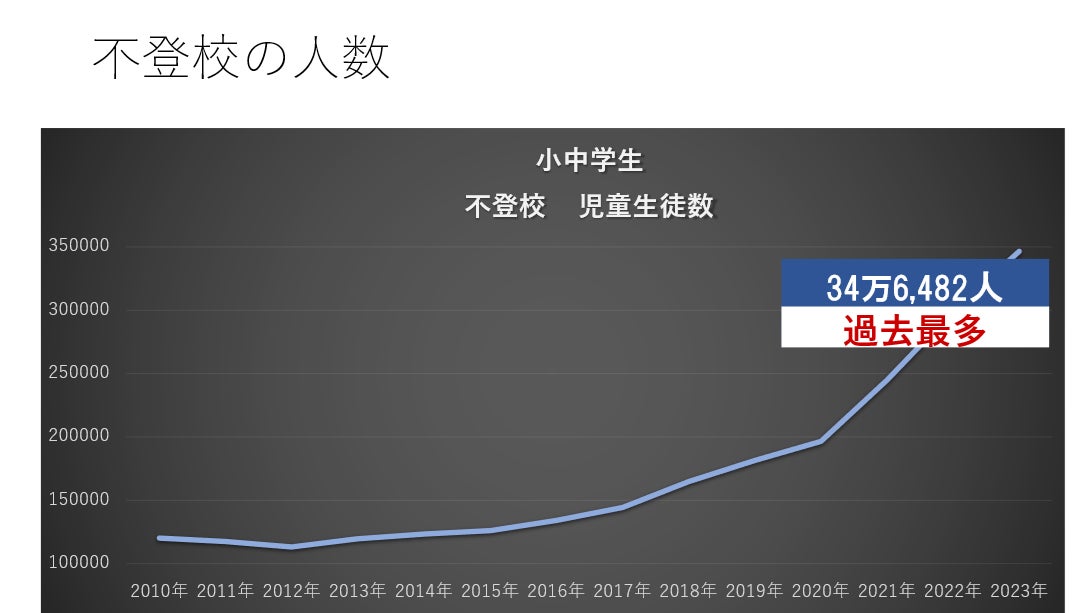 これは最新の調査で明らかになった、不登校の児童生徒数の推移です。見ての通り、その数は年々増え続け、ついに約35万人という、過去最多の数字を記録しました。