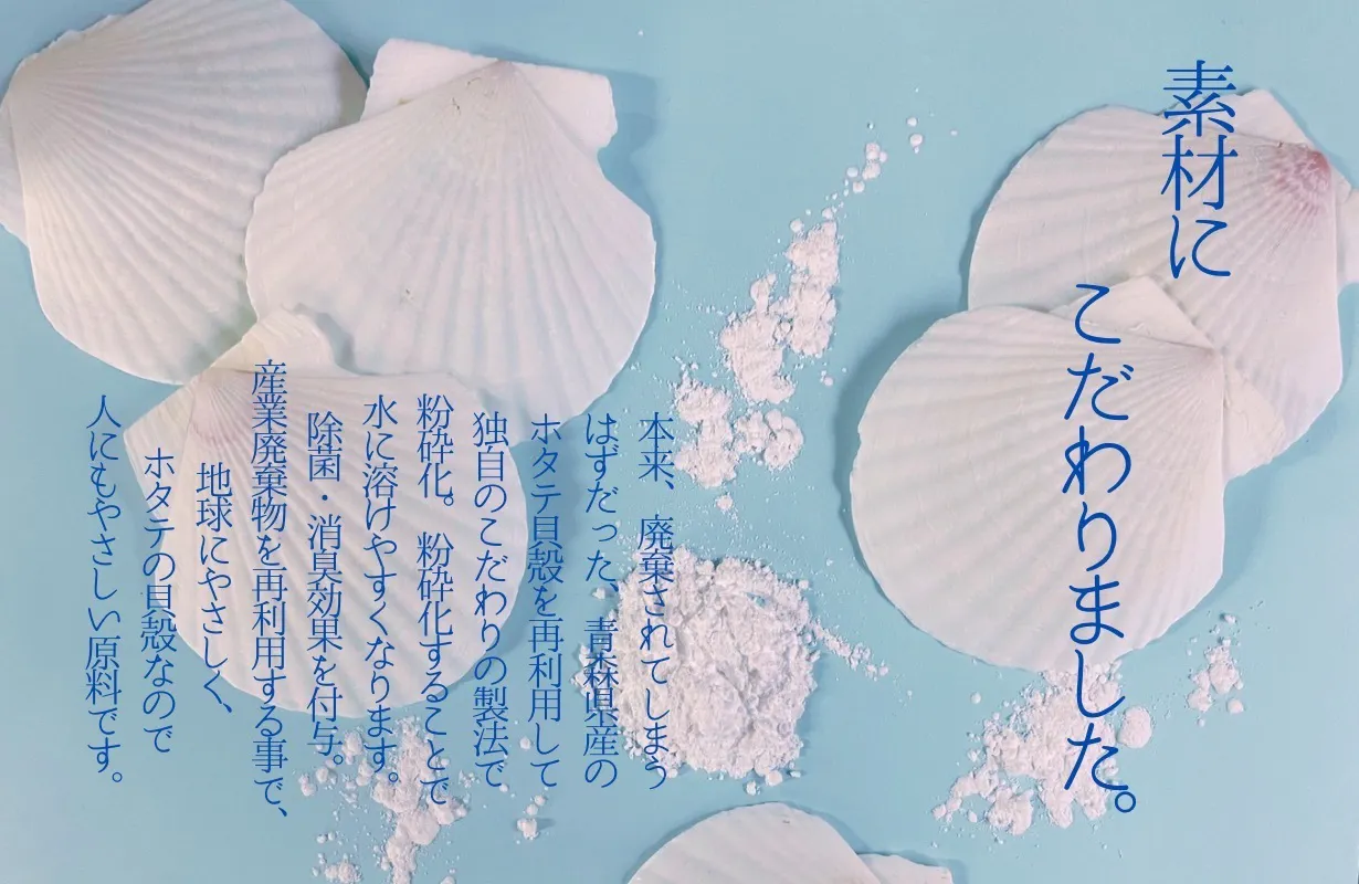 本来、廃棄されてしまうはずだったホタテの貝殻を再利用して独自のこだわりの製法で粉砕化。
