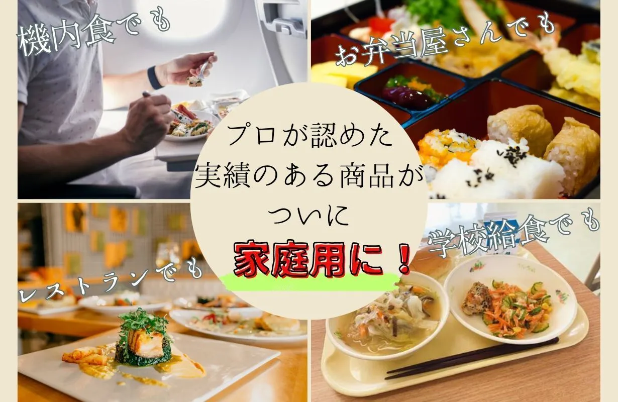 皆様もご存知の大手お弁当屋さんから機内食・幼稚園・学校給食にてご使用いていただいております。