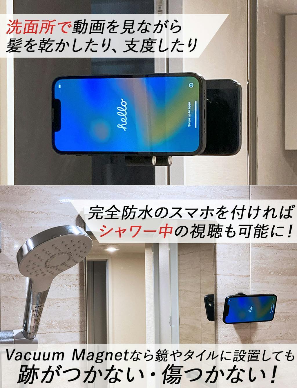Vacuum Magnetのもう一つの魅力は、鏡にも設置可能な点です。朝のドライヤーや歯磨き、セットやメイクをしながら、動画を楽しむことができます。さらに、スマホが完全防水であれば、シャワーや湯舟に浸かりながらも視聴可能です。リラックスタイムをより充実したものにしてくれること間違いなしです。