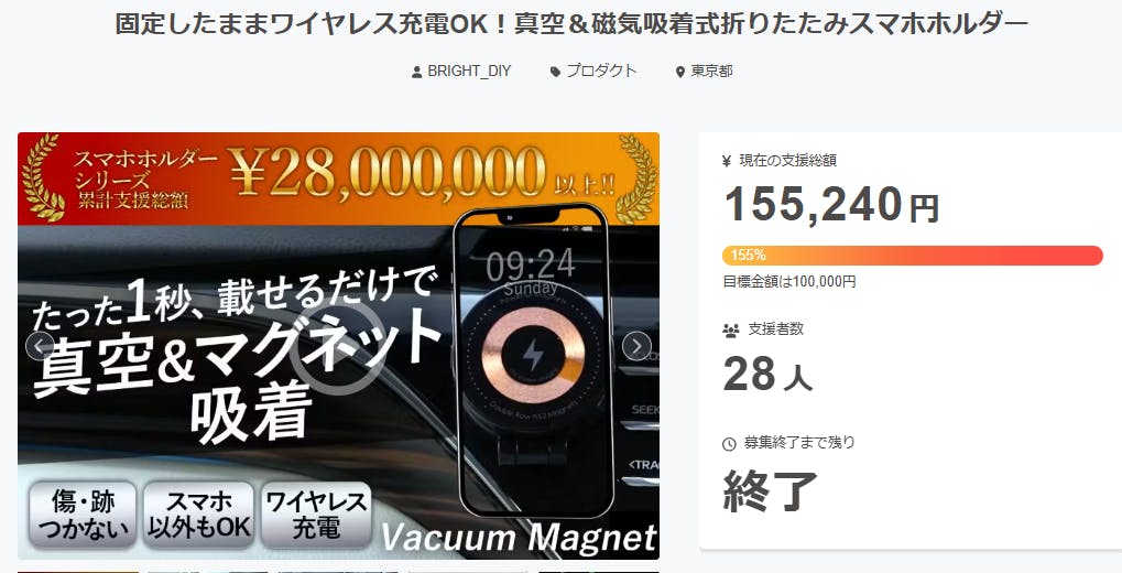 2025/12/01 00:14ご支援者様、固定したままワイヤレス充電OK!真空&磁気吸着式折りたたみスマホホルダーにご興味をお持ちいただきありがとうございます。プロジェクト開始から45日目で28人ものご支援者の方々より支援頂き、無事プロジェクト終了を迎えることが出来ました。早速皆様のリターンを2026年02月末にお届けできるよう準備を始めております!皆様にご満足いただけるリターンをお届けできるよう、全力で取り組んで参りますので引き続き、「固定したままワイヤレス充電OK!真空&磁気吸着式折りたたみスマホホルダー」をよろしくお願い致します。BRIGHTチーム もっと見る