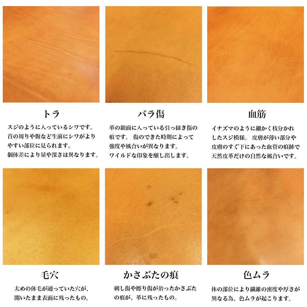 ・本製品は牛革を使用しており、自然な風合いを活かした仕上げのレザーとなります。 革本来が持つ色ムラ・キズ・しわなどが見られますので、皮革の個性としてご理解ください。