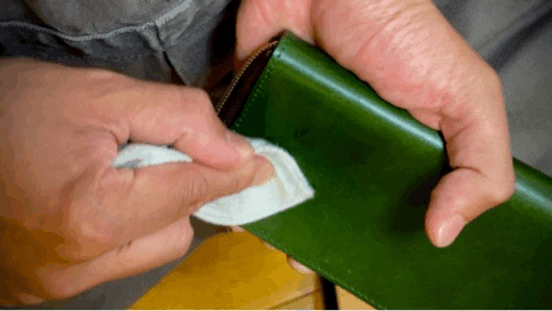時とともに深まっていくエイジングに醍醐味を感じる革なので、「革の色が変わるのを防ぐ」、「購入したままの表情を保つ革」ではありません。