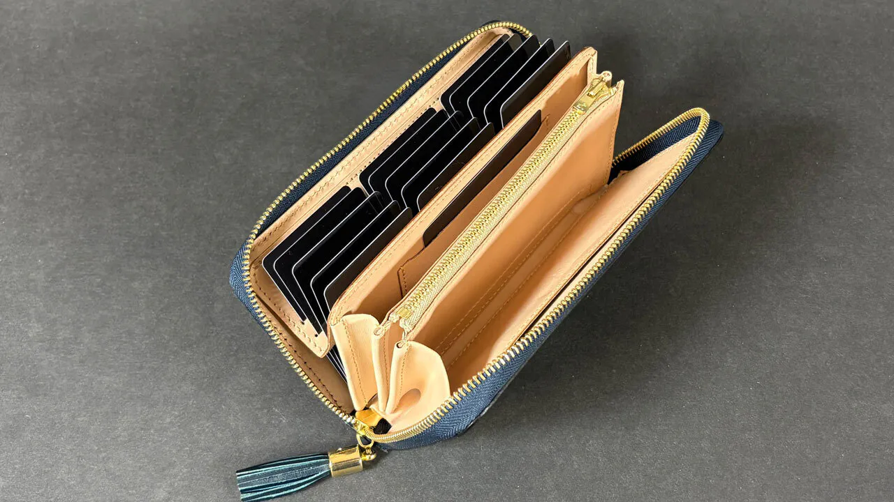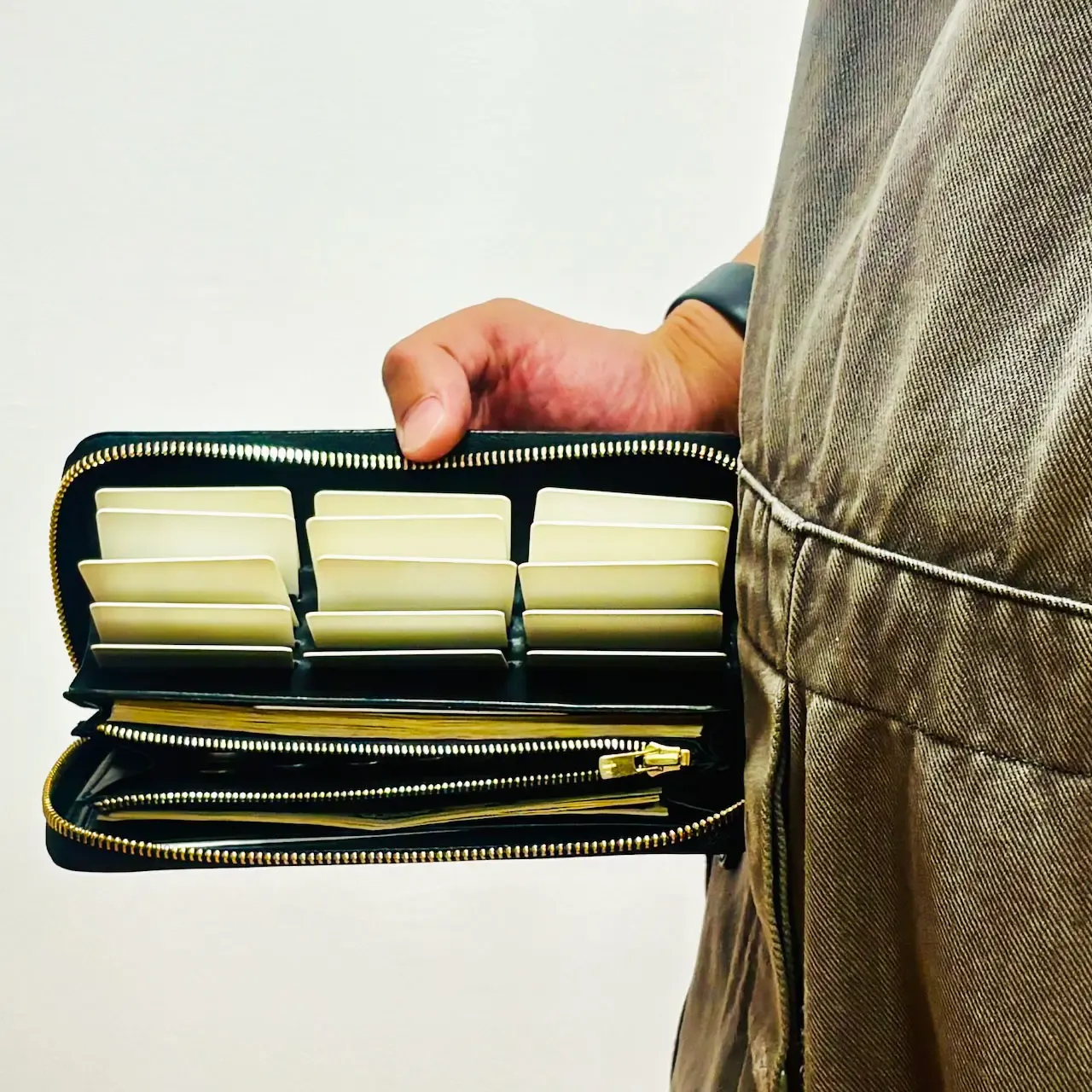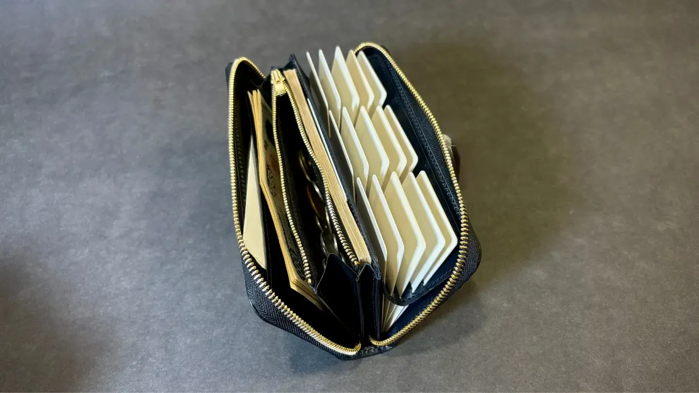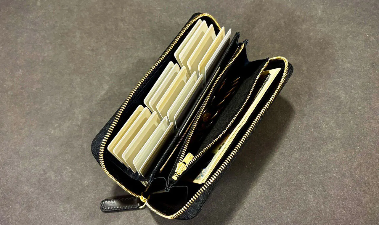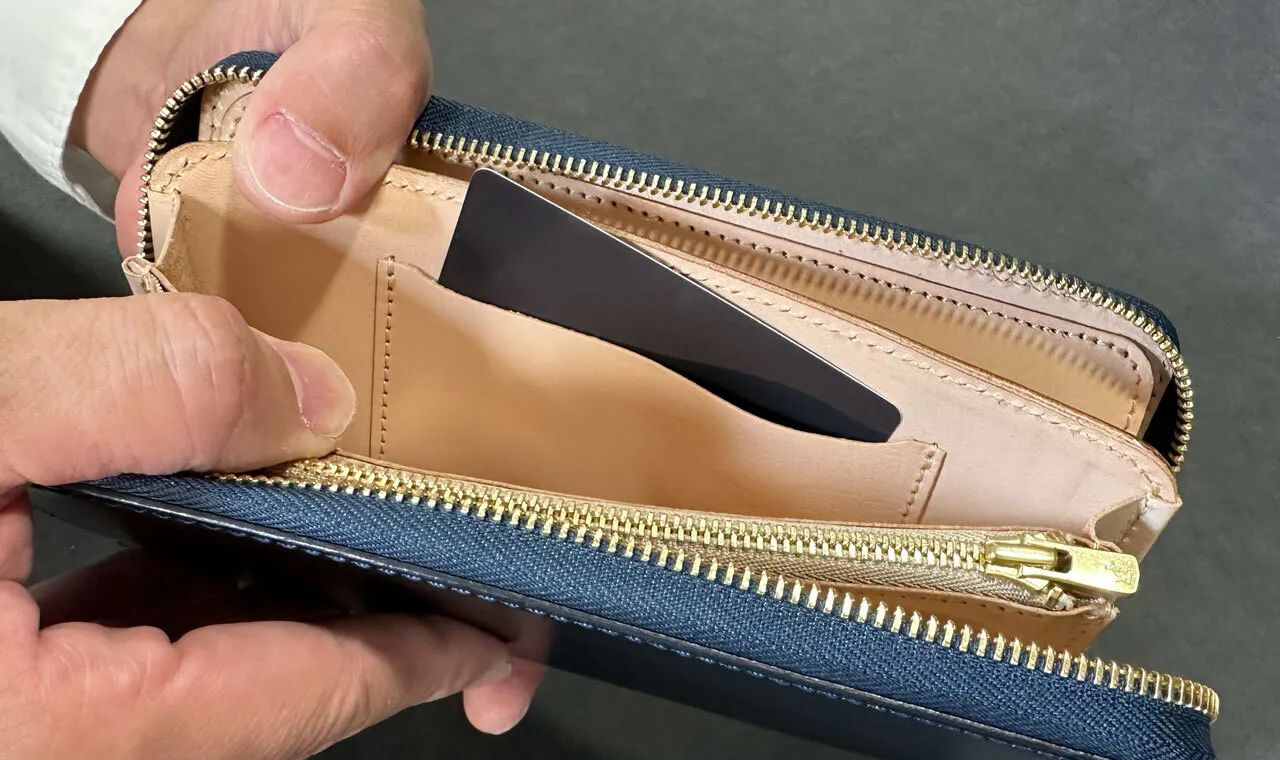 ファスナーがカードの飛び出し防止になるので気にせずしてお使いいただけます。
