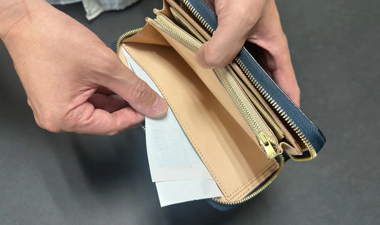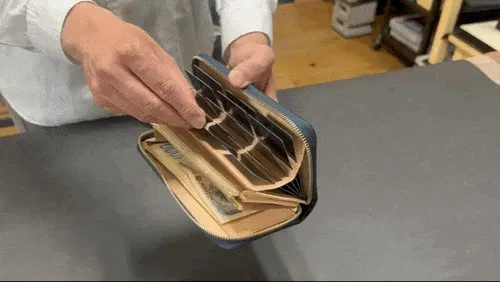 札入れの2部屋のうち、1部屋のマチをはずして札入れをサイドからも出し入れできてスムーズになりました。