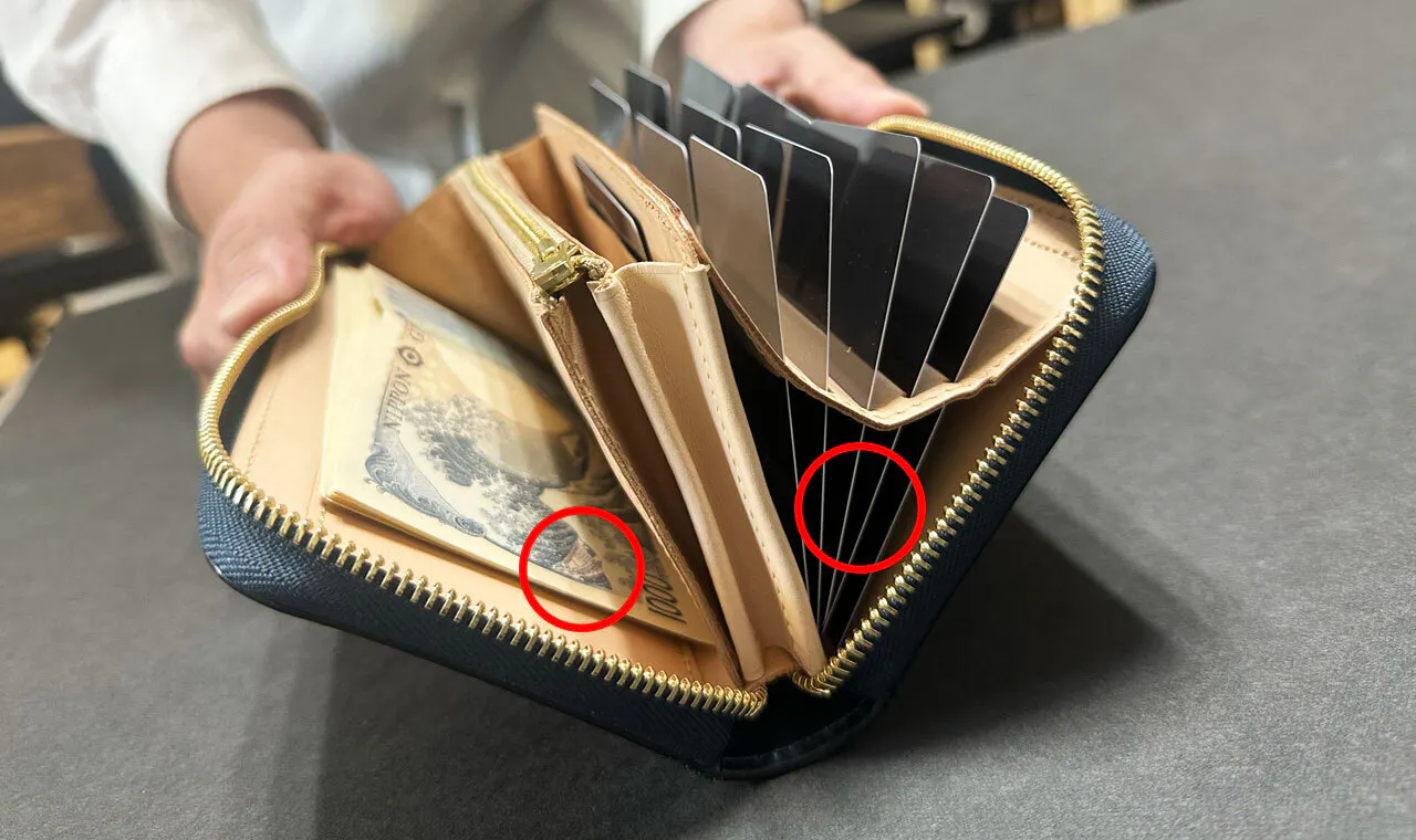 お札を綺麗なまま素早く出し入れできる設計に変更、カードの差し込み時をより快適にする為に今まで使用していたVマチも外しました。