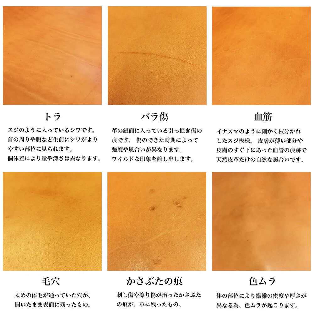 動物の表皮から出来る革は、異なっているのは自然なことであり、どれだけ丁寧な鞣し加工をしても、個体差は避けられません。本革ならではの個性をご理解していただきお楽しみ頂ければ幸いです。