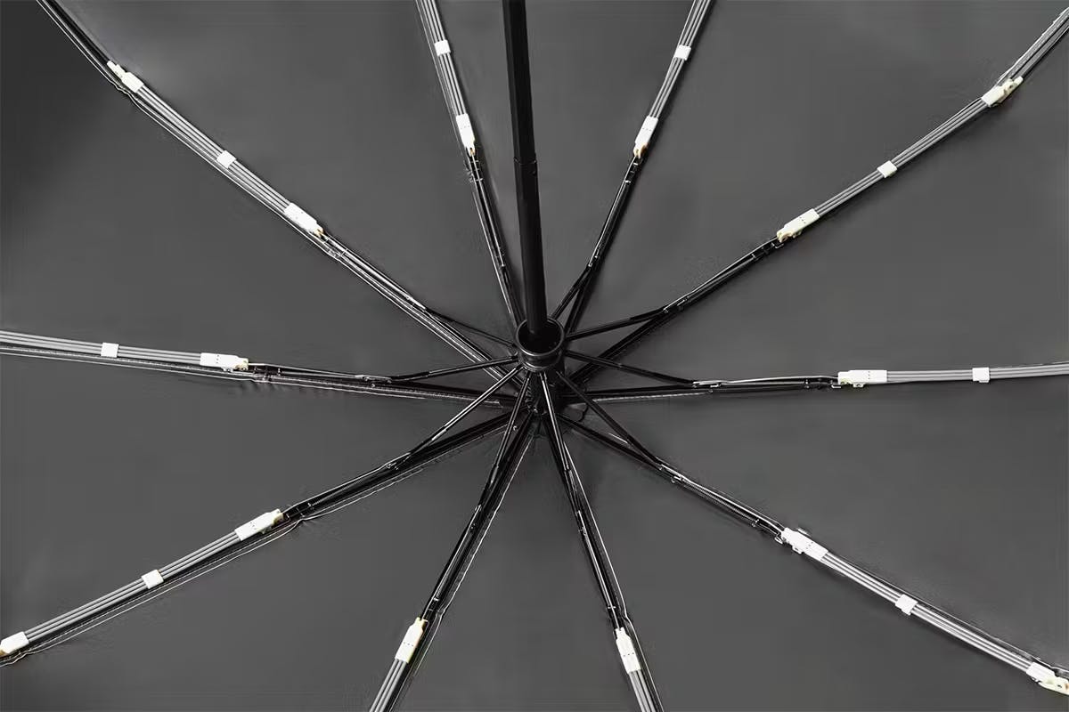 スマートアンブレラの大きな特徴は、その骨組みにあります。一般的な傘が6〜10本程度の骨しか持たないのに対し、スマート傘はなんと30本のグラスファイバー製の骨を採用しています。軽量で弾力性の高い素材を使用することで、強風や衝撃にも耐えられる頑丈な構造を実現しました。