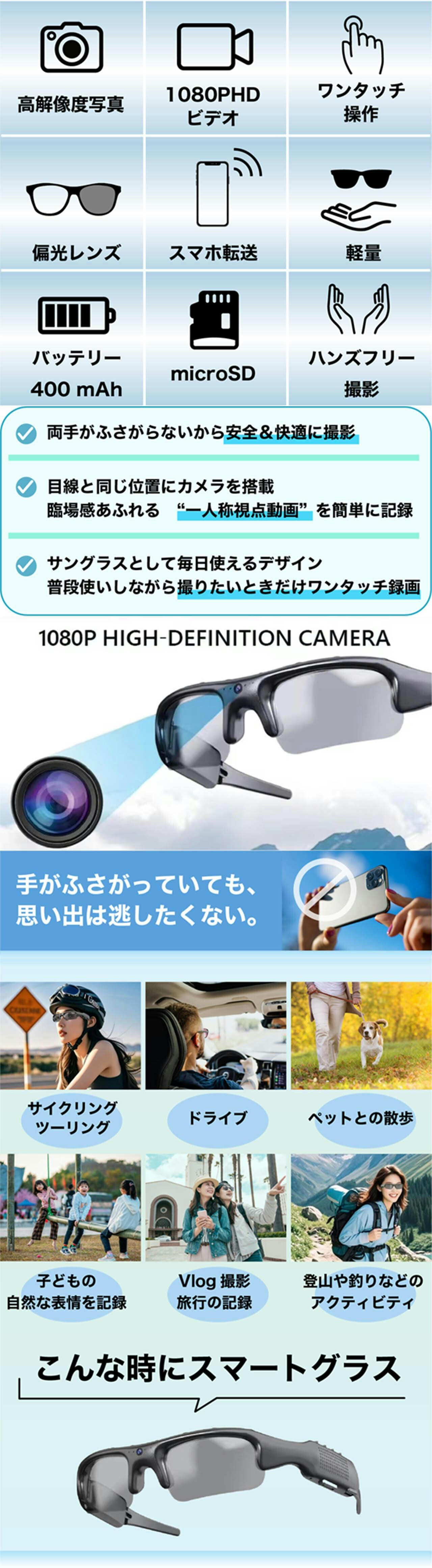 あなたの目が、そのままカメラになる。ワンタッチで簡単録画【スマートカメラグラス】