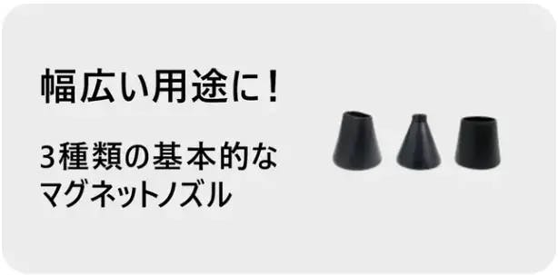 ZERA MAXの基本ノズルは、マグネット式 を採用しており、片手でも簡単に取り付けることができます。従来のねじ式ノズルは、取り付けが面倒だったり、緩みやすく使用中に外れてしまうことがありました。しかし、ZERA MAXのマグネットノズルは、強力な磁力でしっかり固定されるため、使用中に外れる心配がありません。ノズルの交換もスムーズで、作業効率が大幅に向上します。