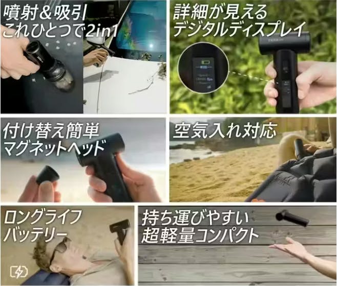 コードレスであることの利便性を損なうことなく、ZERA MAXは従来のエアガンの枠を超えるパワーを持っています。充電式バッテリーを搭載し、自由に場所を選ばず使用できるため、アウトドアや車のメンテナンス、さらには家庭内の掃除にも最適です。コードレスでありながら、パワフルな風を発生させるその技術力は、使う人の期待を超えることでしょう。