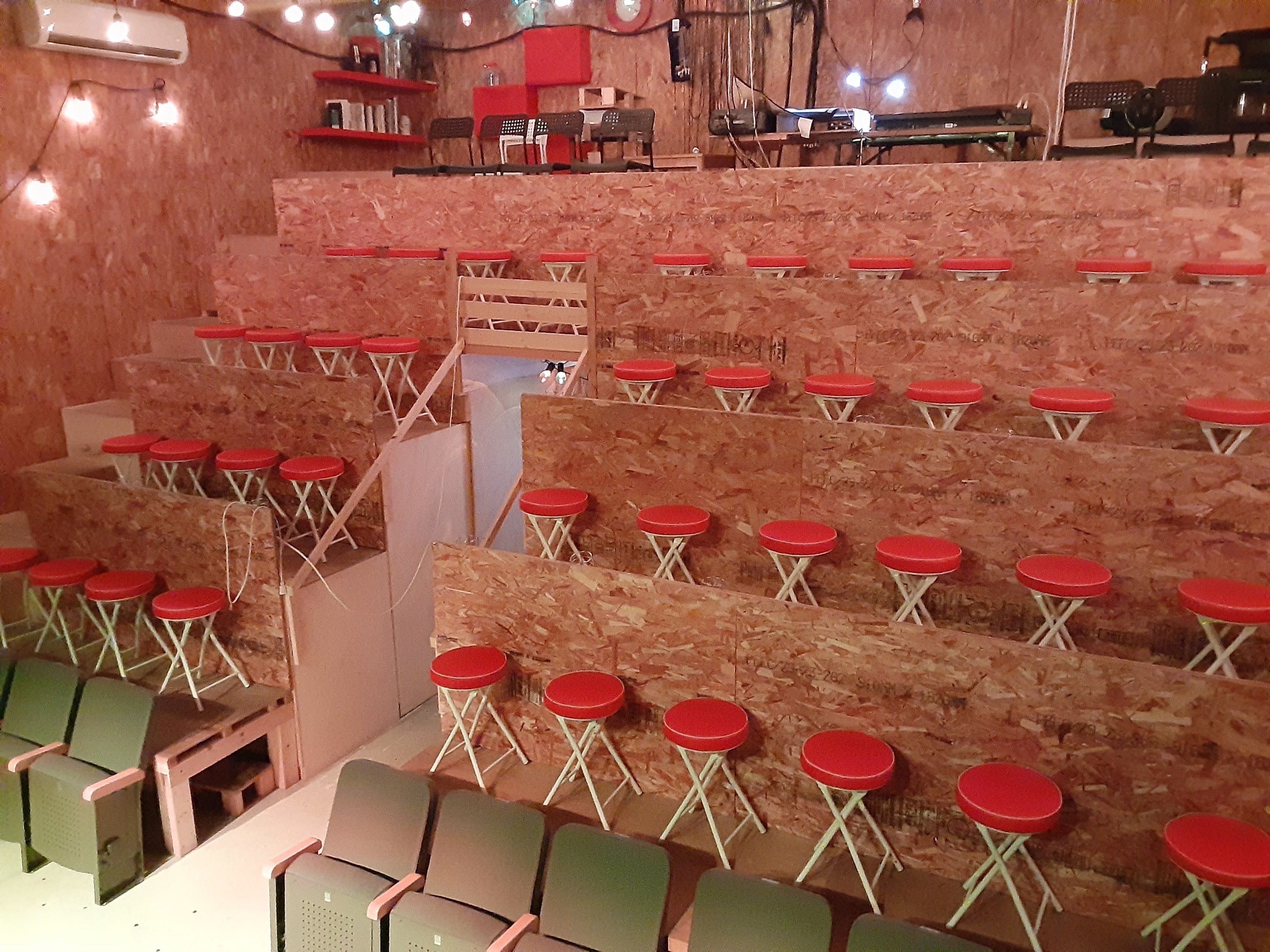 2011年当初、カナリヤ条約の客席は桟敷席だけでした。そして5年後には、現在の折りたたみ椅子を40脚、そろえることができました。この折りたたみ椅子、座面がやや狭いのと背もたれがないので、長時間の観劇には向いてないかもしれません。それでもたくさんのお客さんが、熱心に観劇してくださっています。10年を経た今、もう少し座りやすい椅子を少しだけ買い揃えたいと思っています。