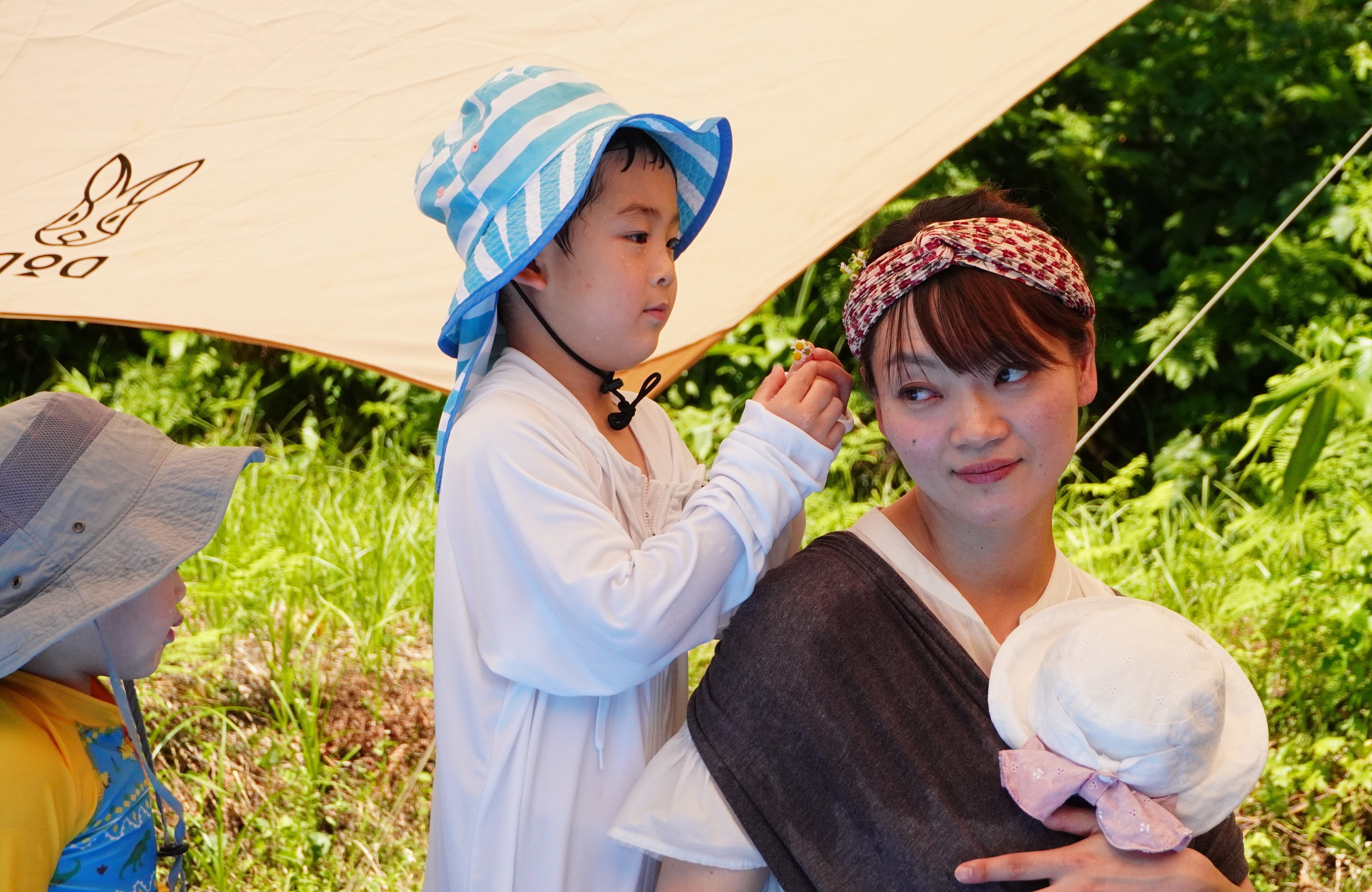 私の頭にお花をつけようとする長男