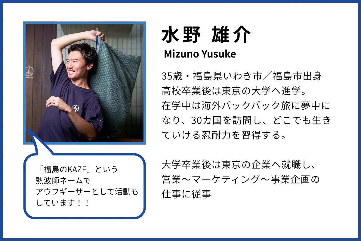 それまで勤めていた会社を退職後は、開業の準備を進めながら、実際のサウナ施設経営や接客を勉強するため、東京のサウナ施設で修行を。ここでアウフグース(熱波)も習得し「福島のKAZE」という熱波師ネームで今も東京のサウナ施設で活動しています。