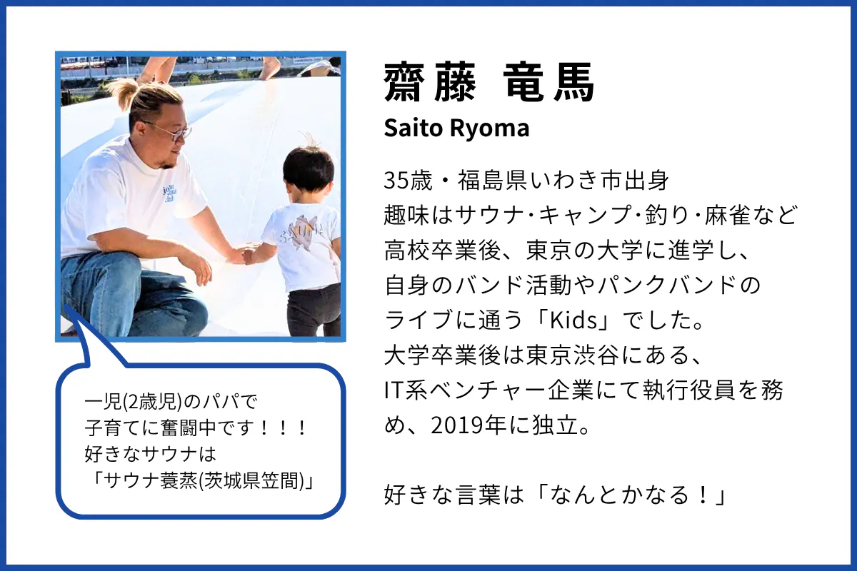 今回のサウナ施設づくりのプロジェクトは、いわき市出身の中学・高校・大学の同級生コンビ齋藤と水野が共同創業という形で始まりました。二人ともいわき市内の高校卒業後は東京の大学へ進学、卒業後はそれぞれ東京のベンチャー企業で切磋琢磨し、35歳のタイミングで共通の趣味「サウナ」を地元いわきに作ることを決意。