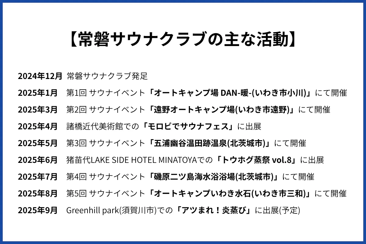 常磐サウナクラブとして、福島県内のサウナイベントに呼ばれることも増え、いわき市だけでなく、福島県や茨城県、東北のサウナ仲間もでき、「常磐サウナクラブ」は、私たちのサウナ活動にはなくてはならない存在となりました。