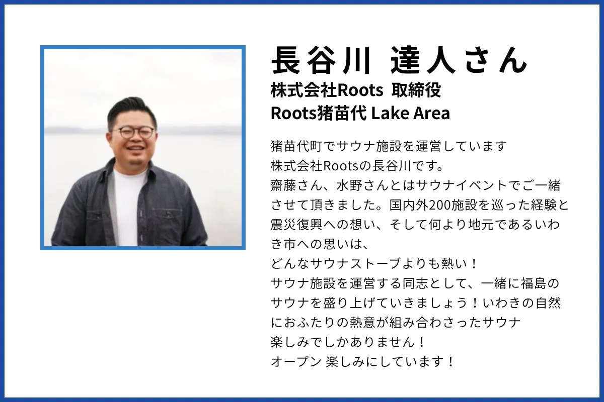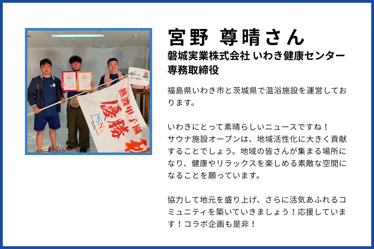 まずは、JOBAN SAUNA1店舗目を地元の方に愛される施設にしていきながら、いわき市、福島県、茨城県のサウナ人口も増やしていけるよう、色々な業界の方々とも連携していきます。ご指導よろしくお願いいたします。