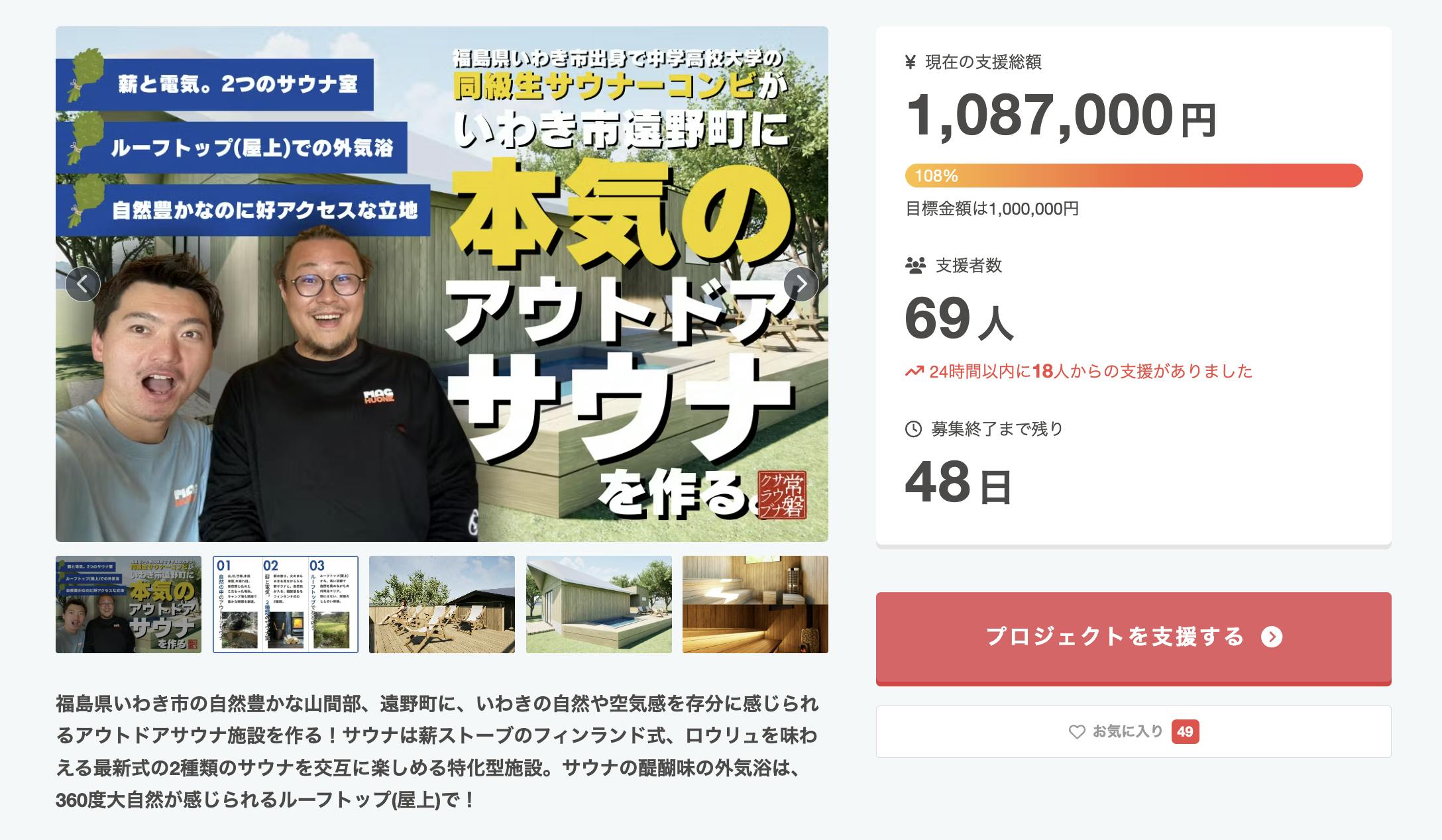 2025/09/11 19:00「福島県いわき市に360度の絶景でととのえる新感覚サウナ施設をつくる!」皆さま!改めまして常磐サウナクラブの水野と齋藤です!昨日9/10(水)11:00よりクラウドファンディングをスタートいたしました。私たち自身も初めてのクラウドファンディングで、準備の段階からどのように進めようか、どのように告知していこうか、果たして支援が集まるのかなどいろいろな不安な気持ちを抱きながら手探りで進めてきましたが、スタート初日からたくさんの方にご支援いただき、開始後24時間以内の目標達成率が70%を超えました!これはすごく良いスタートダッシュで、ひとえに私たちの取り組みに賛同してくださったご支援者の皆さまのおかげです。改めて、御礼申し上げます。昨日、インスタライブをご覧いただいた方もいらっしゃると思いますが、現在の工事状況や現地の様子を紹介しております。ぜひ下記リンクからご覧いただけると幸いです。https://www.instagram.com/reel/DOaBrnHEQi9/【建設地・遠野町の紹介】今回私たちがサウナを作っている遠野町は、人口4,500人弱の中山間地域と呼ばれるエリアで、地域の大半を森や田畑が占めています。サウナ建設地から少し北上すると、イワナやヤマメが狙える渓流釣りのスポットがあったり、水のよさを生かした人気のお蕎麦屋さんがあったり。古くからの製法で作られる遠野和紙も有名で、遠野町の地域おこし協力隊の方々がその技を引き継ぎ、今も伝承されています。建設地からすぐの上遠野城跡(八潮見城)は大人から子どもまで楽しめるプチ登山コースがあり、頂上からは太平洋を望めます。遠野町はこうした地域資源を生かした食やアクティビティが充実しており、大自然を満喫するには最高の場所。市街地から車で20〜30分と、実はアクセスも良好です。正直、私たちも子どもの頃は遠野に足を運ぶことはめったにありませんでした。「遠野」は文字に「遠(とお)い」が入っている分、遠い場所だと勝手に思い込んでいましたが、実際に行き来するようになると「こんなに近いんだ」と再認識しました。このサウナがきっかけになり、たくさんの方が遠野町に遊びに来てくださることを願っています。このクラウドファンディングでは、ここからさらに多くの方にいわきのことや遠野町のこと、そしてサウナのことを知っていただけるよう、全力で走り抜けていきます。皆さま、引き続きこのサウナ建設プロジェクトを応援よろしくお願いいたします!何かお気づきの点やご意見、ご不明な点等がございましたら、お気軽にコメントいただければ幸いです。P.S.現在、15,000円の【全グッズ(Tシャツ・サウナハット・ステッカー)+プレオープン招待券1枚】が人気で、残り2つとなりました!まだまだ応援よろしくお願いいたします!!!常磐サウナクラブ水野雄介/齋藤竜馬 もっと見る