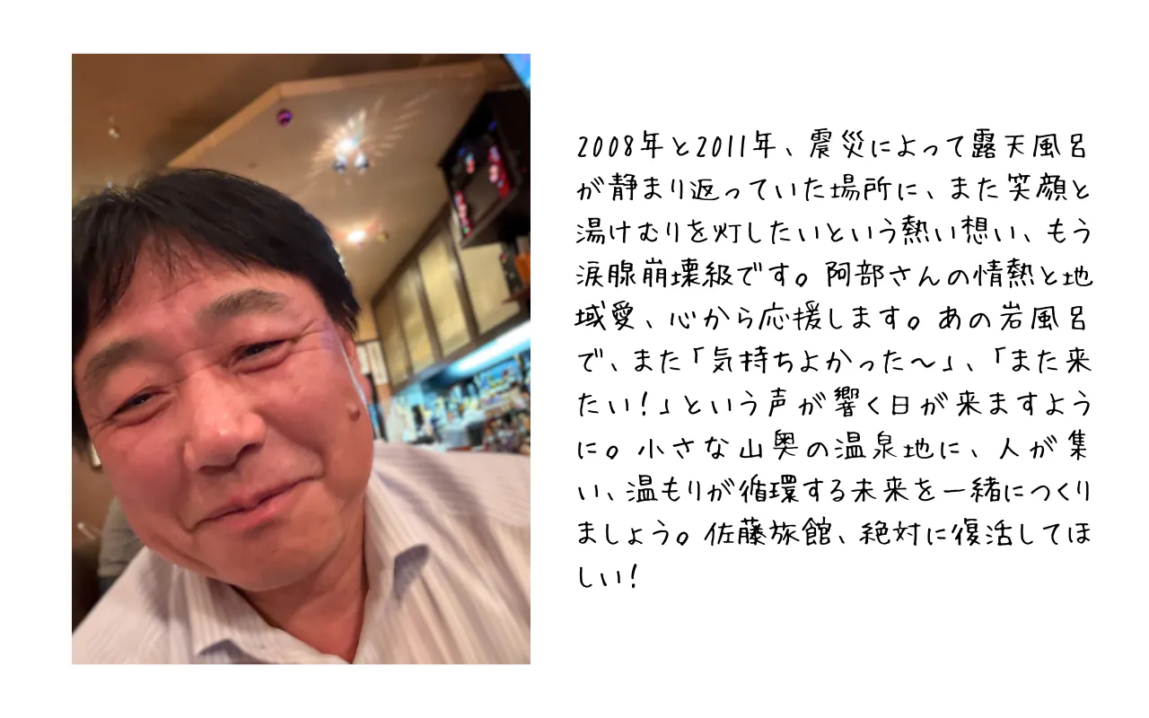このクラウドファンディングは、単なる設備の再建ではありません。 佐藤旅館を、そして温湯温泉を、地域の希望をつなぐ場所として再生させる挑戦です。 皆さまと一緒に、「温湯」のぬくもりを未来につないでいきたいと思っています。