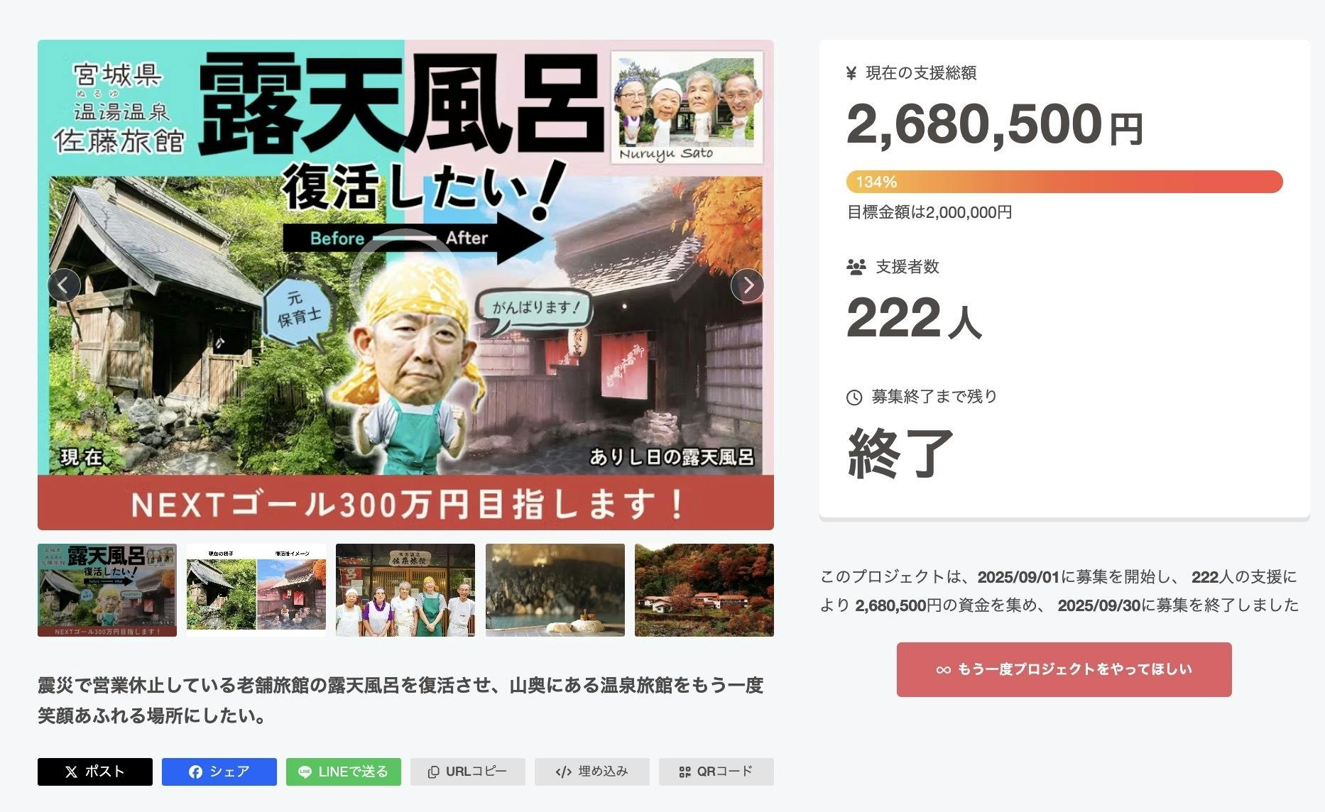 2025/10/01 10:58昨日をもって、クラウドファンディング無事終了しました。このプロジェクトを通じて、222名から268万500円のご支援をいただきました!本当に応援ありがとうございました。支援者の皆様には、今後について随時ご案内させていただきます。また、露天風呂の進捗共有も、活動報告やSNSを通じて実施いたします!Instagram:https://www.instagram.com/nuruyu_satoryokan/X:https://x.com/nuruyu_satoまずはお礼のご連絡でした。今後とも、温湯温泉佐藤旅館をよろしくお願いいたします! もっと見る
