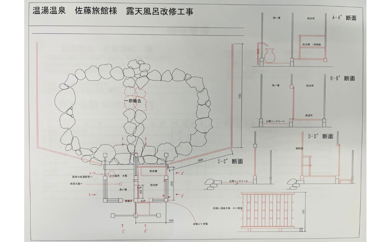 露天風呂の再建には、単に浴槽を直すだけではなく、現行の保健所の基準を満たすための設備や動線の整備が必要です。