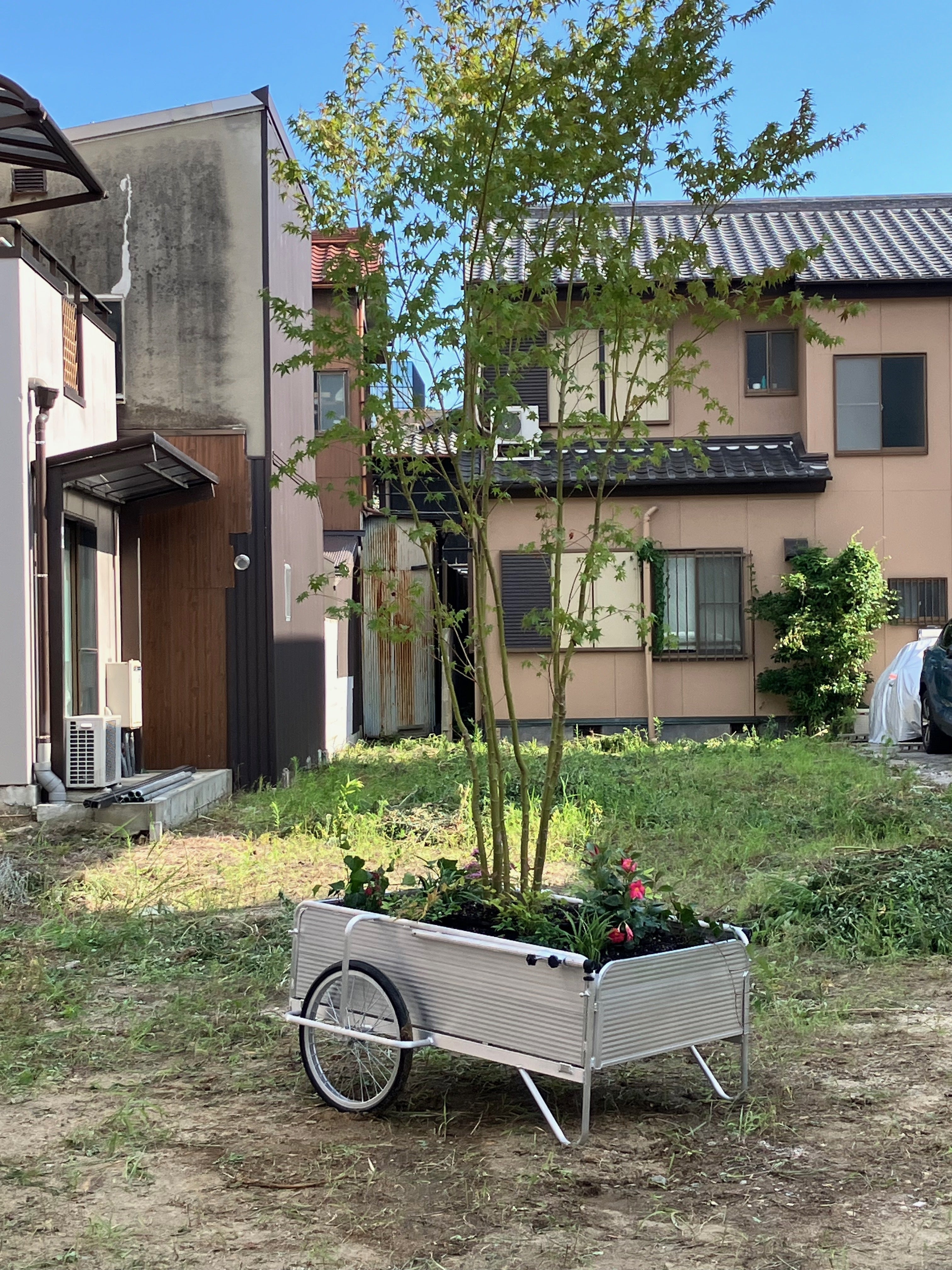 突然現れた植栽をのせたリヤカーに興味を持つ方も。