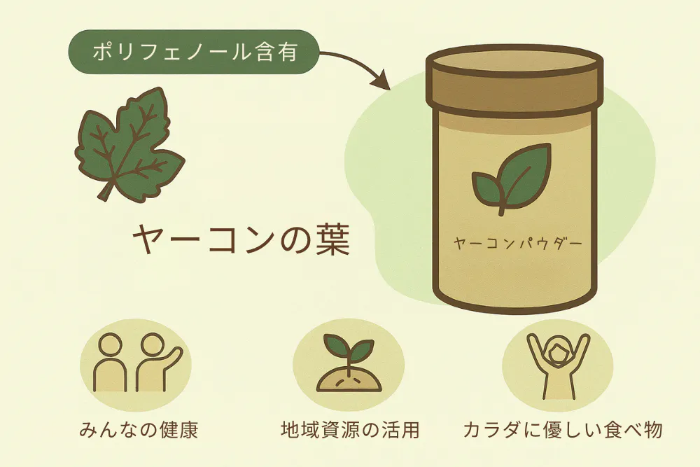 ヤーコンの“葉”には、根に負けないほどの栄養価があり、とくにポリフェノール成分には糖の吸収をゆるやかにする働きが期待されています。私たちはこの未活用資源を使い、飲みやすく日常に取り入れやすい健康パウダーとして新商品を開発します。自然の力を活かした“からだにやさしい食品”を皆様に届けるとともに、農業の持続可能な未来にもつなげたいと考えています。