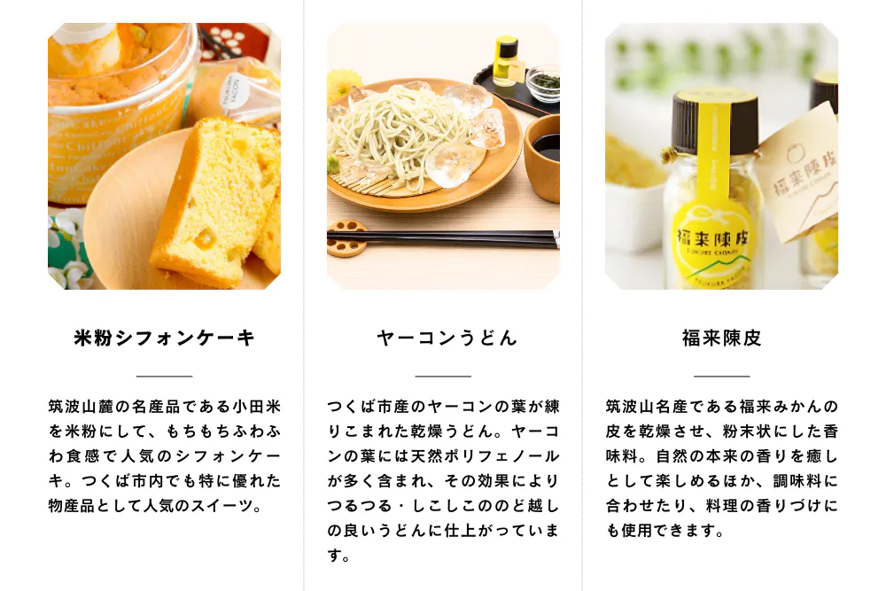 ・つくば小田米、米粉シフォンケーキ(賞味期限が短いため、TXつくば駅「つくばの良い品店」店頭お渡しとなります。配送はできませんのでご了承ください)