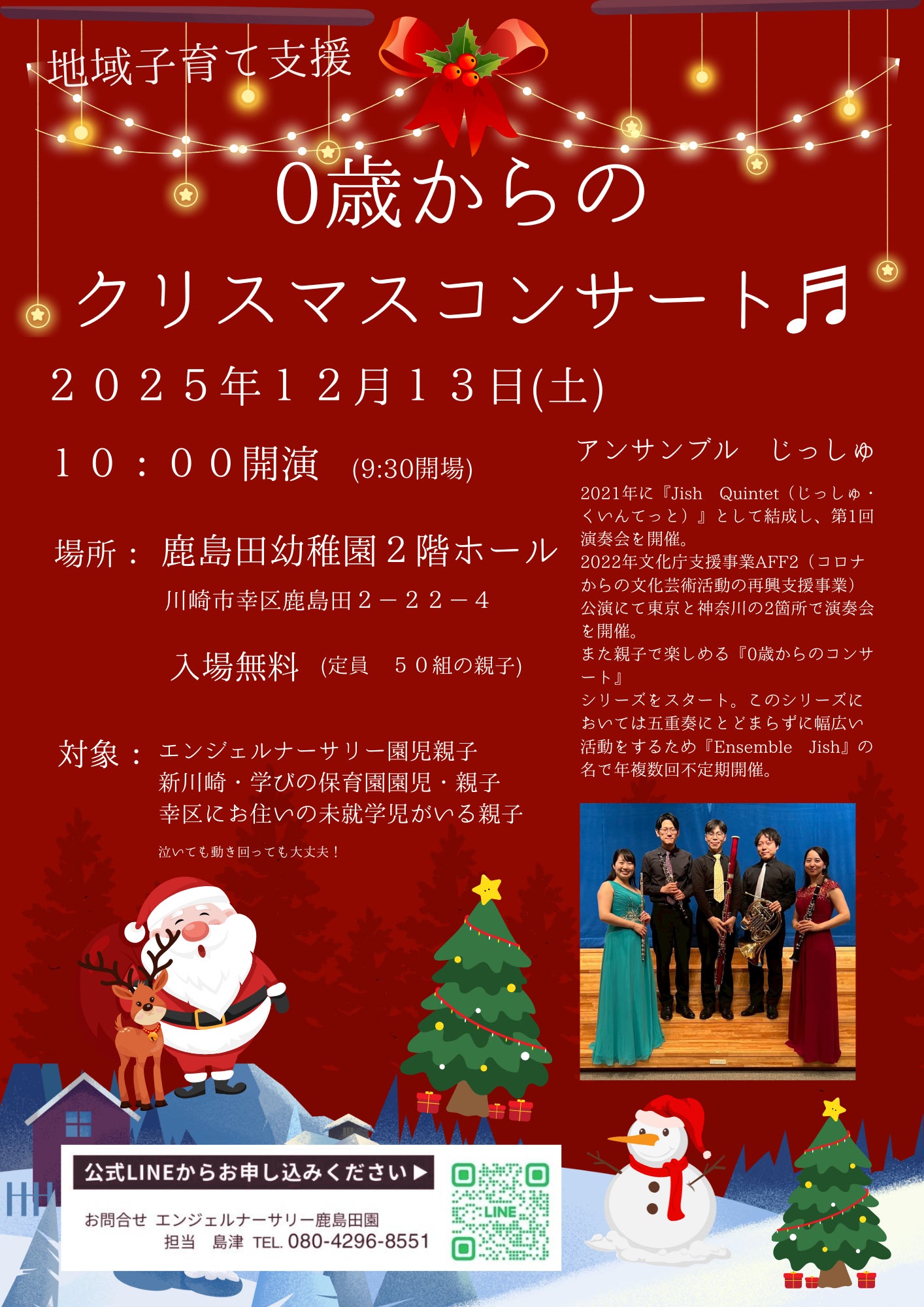「0歳からのクリスマスコンサート」を開催します!地域子育て支援イベントとして、0歳から楽しめるクリスマスコンサートを開催します。日程は2025年12月13日(土)10:00〜会場は**鹿島田幼稚園2階ホール(川崎市幸区)です。演奏をしてくださるのは、クラシックや親子向けコンサートで活躍中の「アンサンブル じっしゅ(Ensemble Jish)」の皆さん。本格的な生演奏を、赤ちゃんと一緒にリラックスして楽しめる特別な時間をお届けします。地域の保育園・幼稚園の親子を中心に、泣いても動き回っても大丈夫!音楽を通して、親子で心あたたまるひとときを過ごしていただければと思います。本コンサートは、皆さまからのご支援によって実現できました。あたたかいご支援・ご協力に心より感謝申し上げます!!