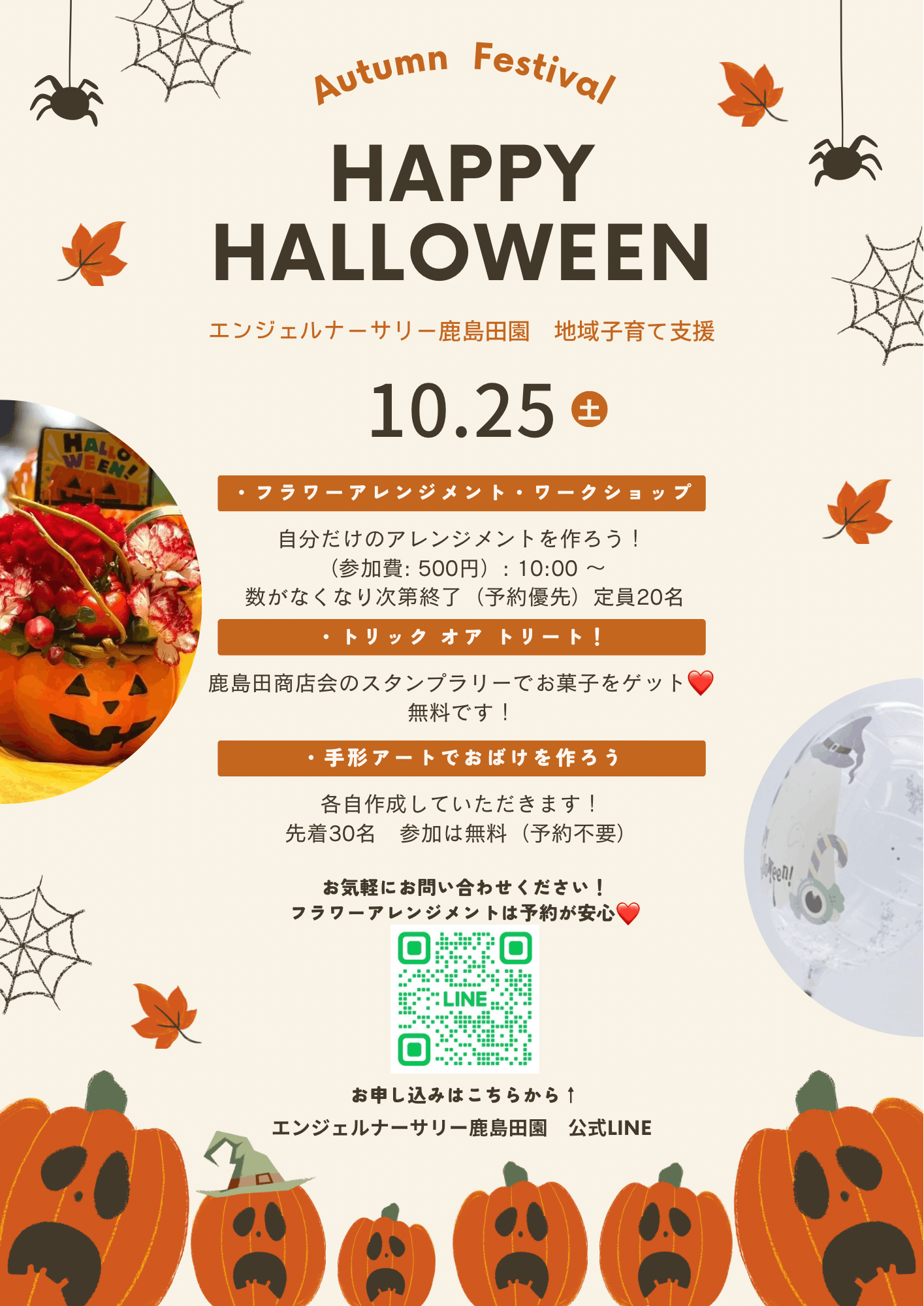 エンジェルナーサリー鹿島田園が、鹿島田ハロウィンに便乗して地域のご家族向けに企画したアットホームなお祭りです。フラワーアレンジメントから手形アート、トリックオアトリートまで、親子で気軽に参加できます。