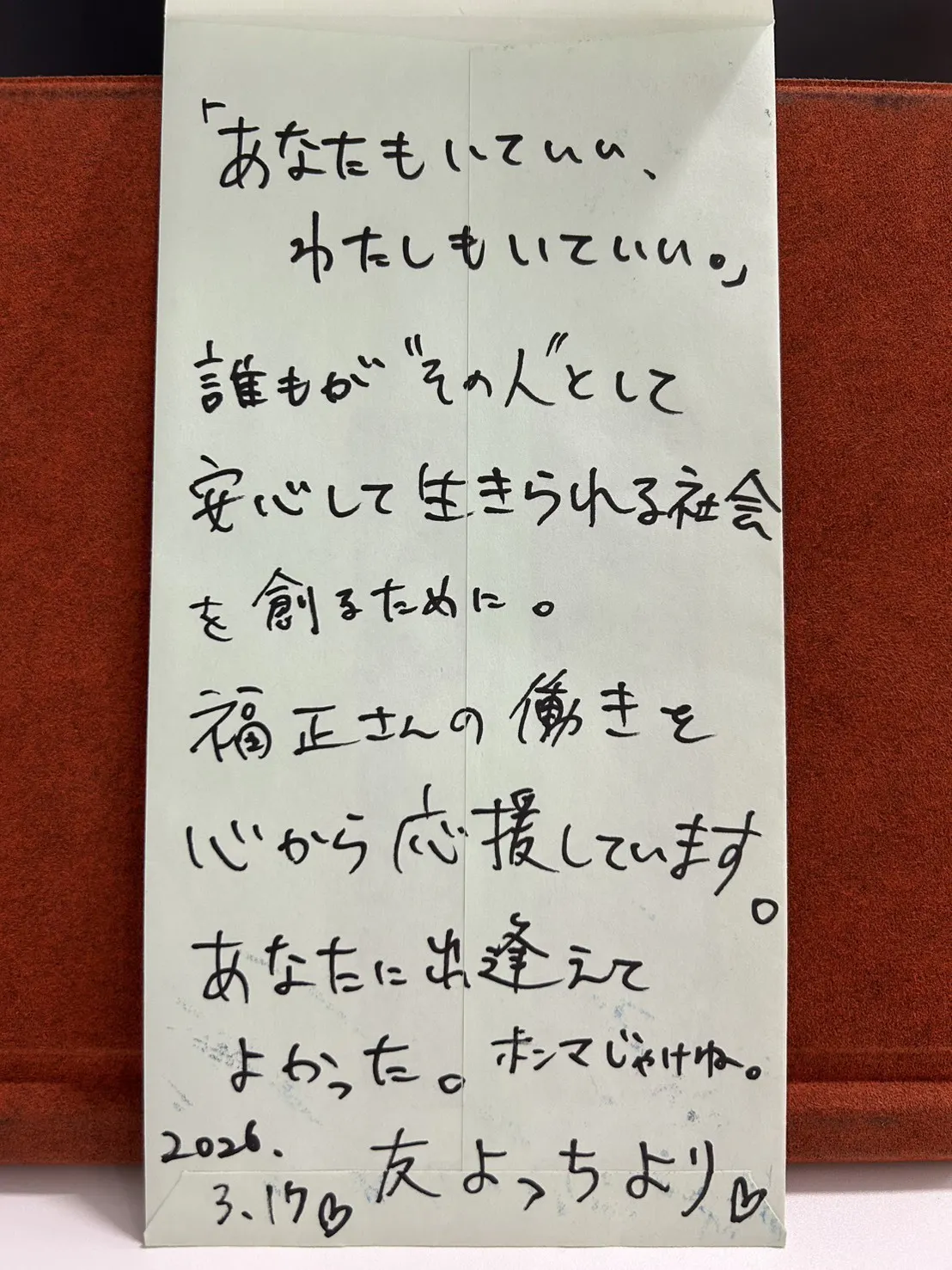 2026/03/16 22:20「あなたもいていい、 わたしもいていい。」 誰もが“その人”として 安心して生きられる社会 を創るために。 福正さんの働きを 心から応援しています。 あなたに出逢えて よかった。ホンマじゃけね。よっち …介護支援専門員 もっと見る
