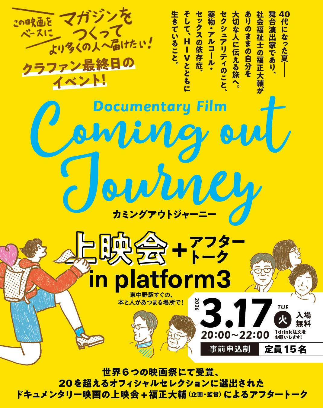 突然ですが、このクラファンの最終日でもある3月17日(火)20:00から22:00まで、東京・東中野にあるplatform3という本屋さんで、「カミングアウトジャーニー」の上映会(①のみ)と福正大輔によるアフタートークを開催することにしました!