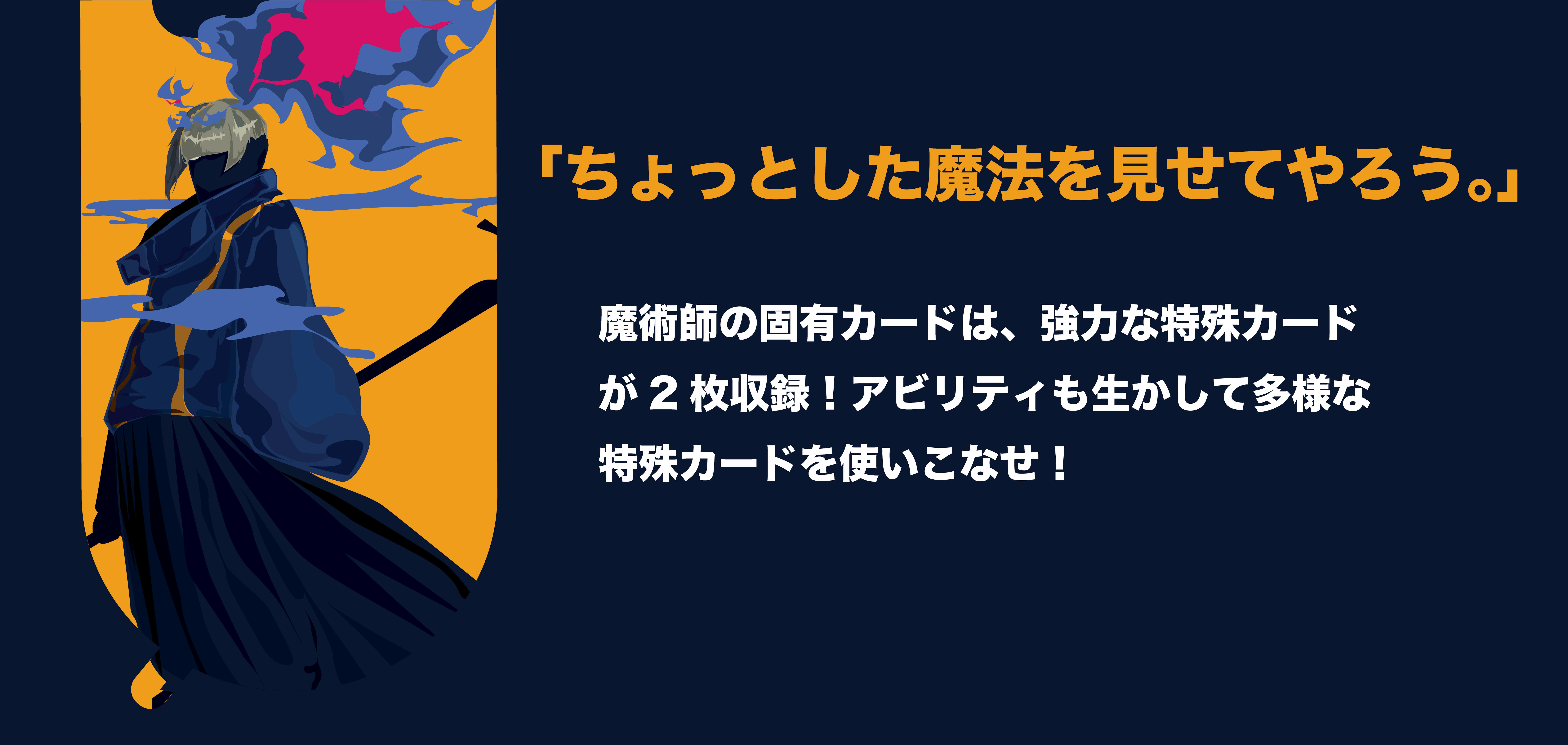 【冒険者セットの内容】冒険者セットの内訳は全てのセット共通で、・プレイヤーカード1枚・固有カード3枚・モンスターカード2枚になっています。【アビリティについて】各冒険者のプレイヤーカードにはアビリティーが記載されています。アビリティーとはゲームプレイ中永続でその冒険者を使用しているプレイヤーに発揮される効果です。【固有カード】冒険者は獲得しているEXP数によってレベルが上がります。固有カードは冒険者のレベルアップによって獲得できるカードです。魔術師のコンセプトは、多様な特殊カードを使って相手の思考をかき乱す冒険者です!魔術師セットを使いこなしてラストキルを目指しましょう!