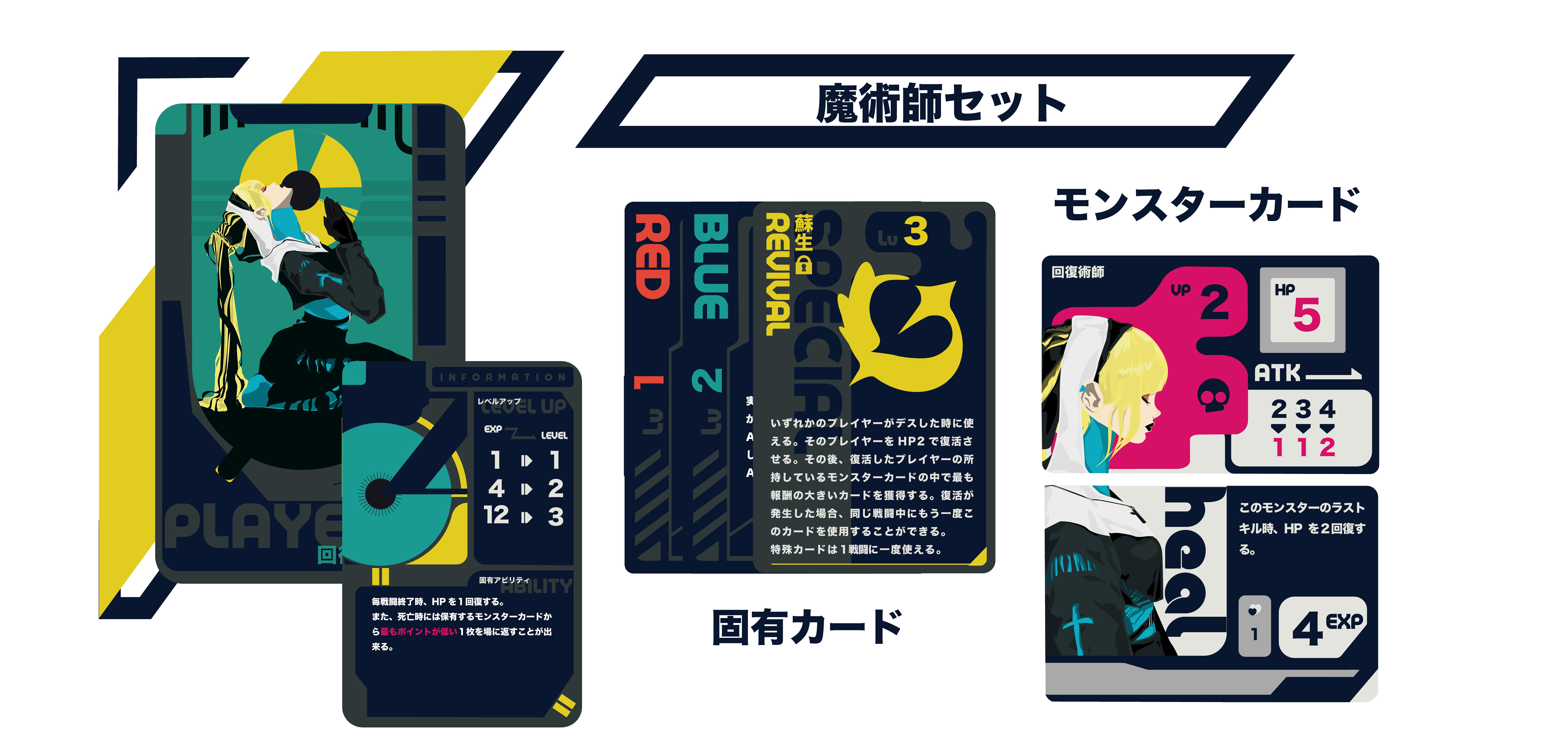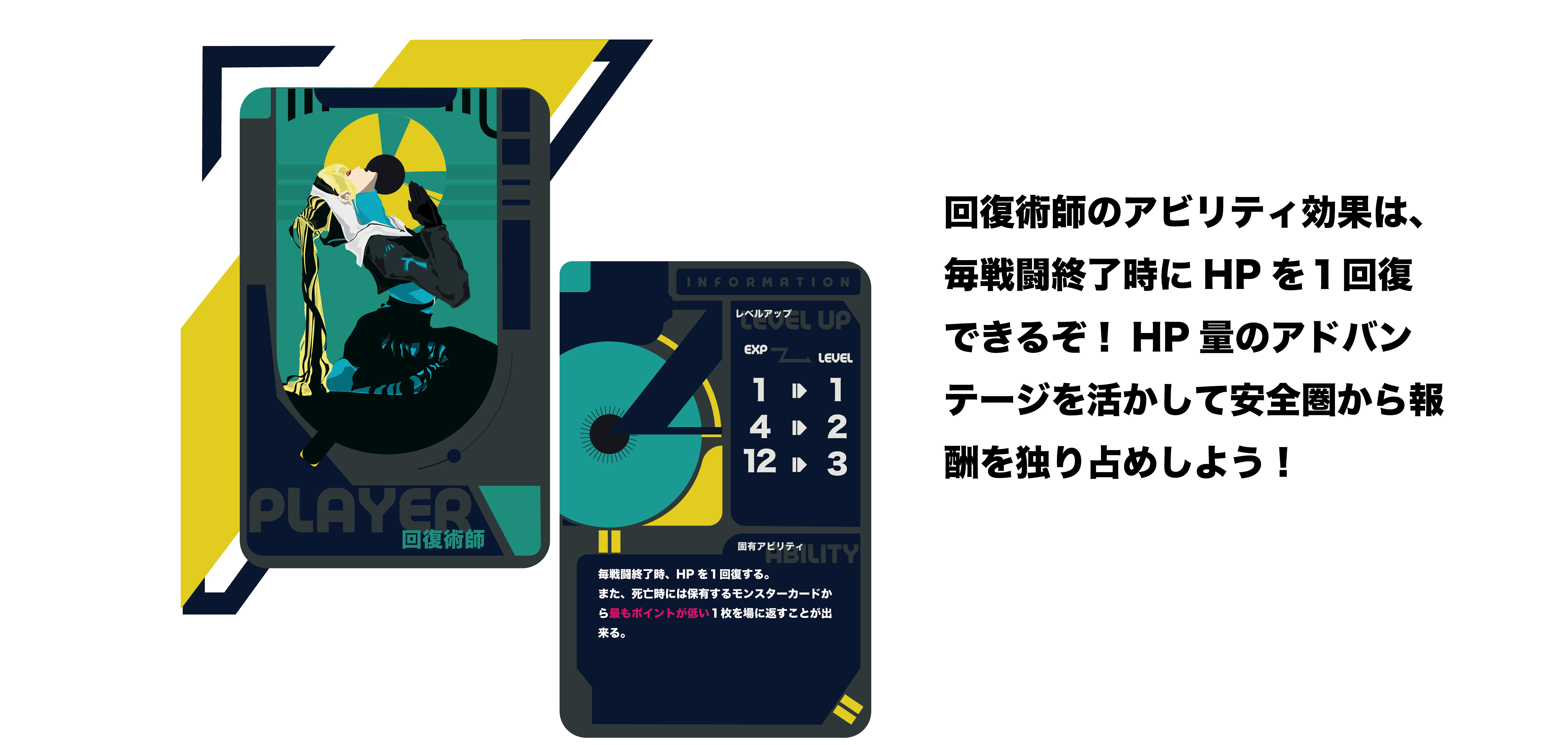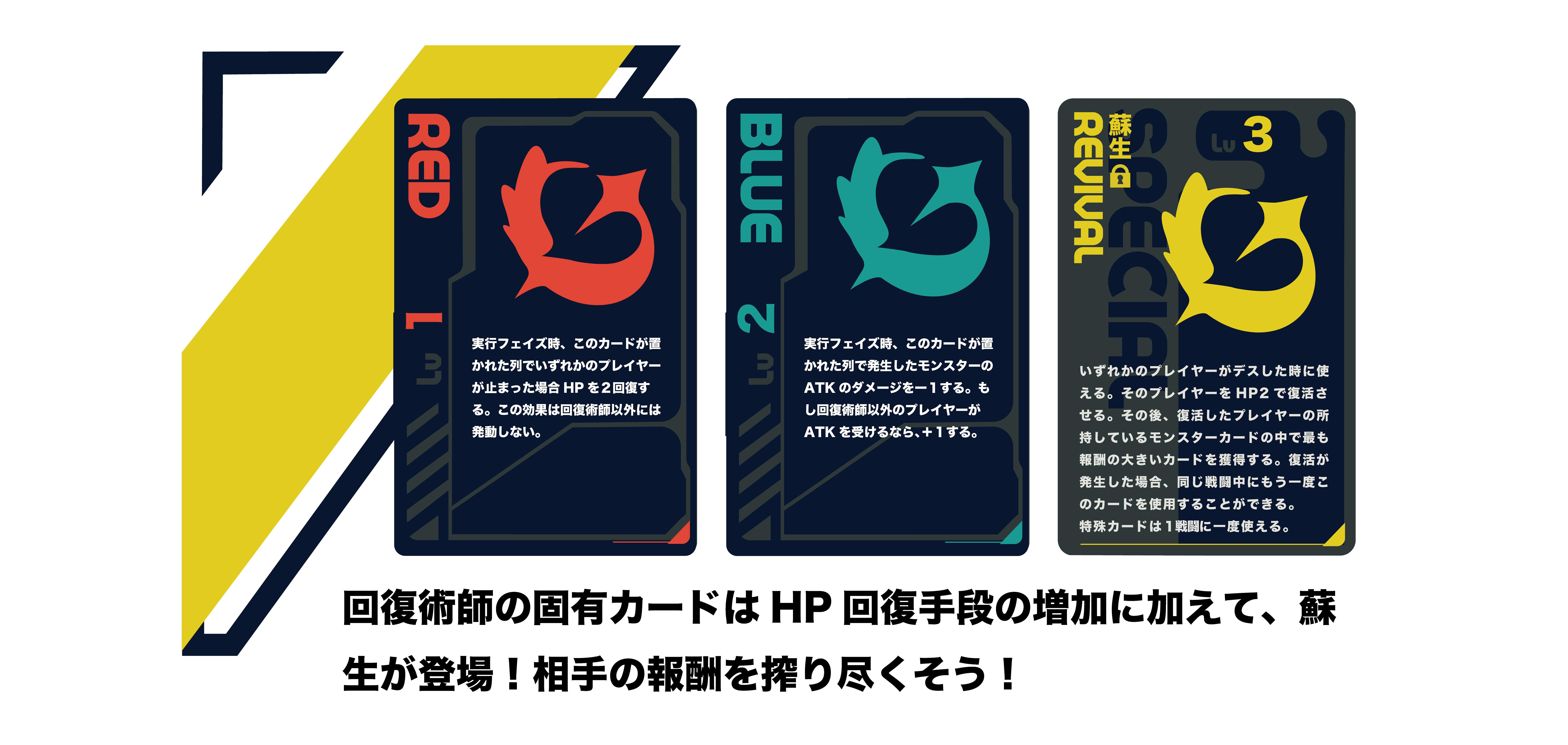 回復術師のコンセプトは、HPのアドバンテージを活かして安全圏から報酬を独り占めする冒険者です!レベル3固有カードでは、相手や自分を復活させることができ、復活させた相手から報酬を奪うことができます。クセの強いカードを使いこなして勝利を目指しましょう!