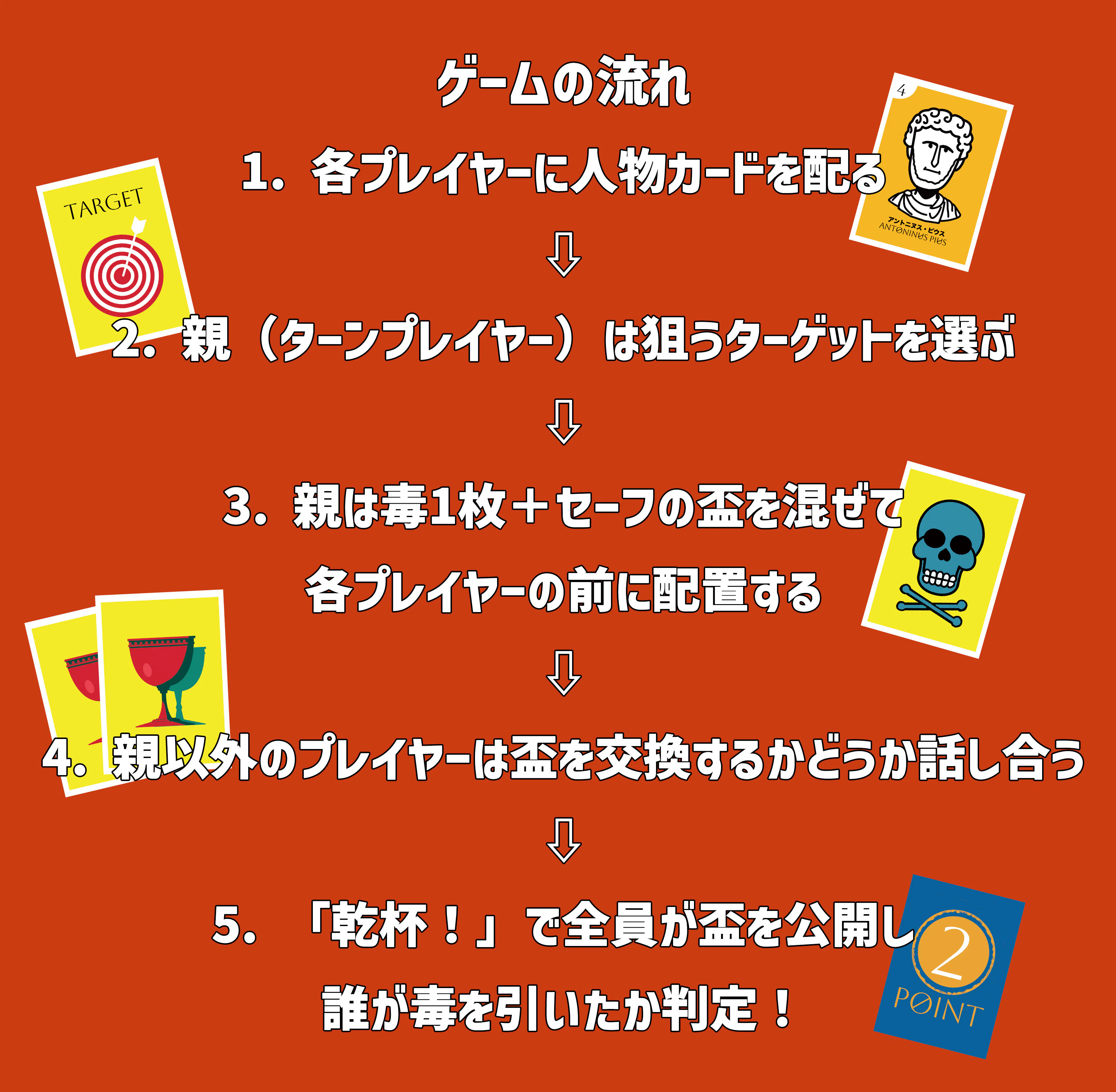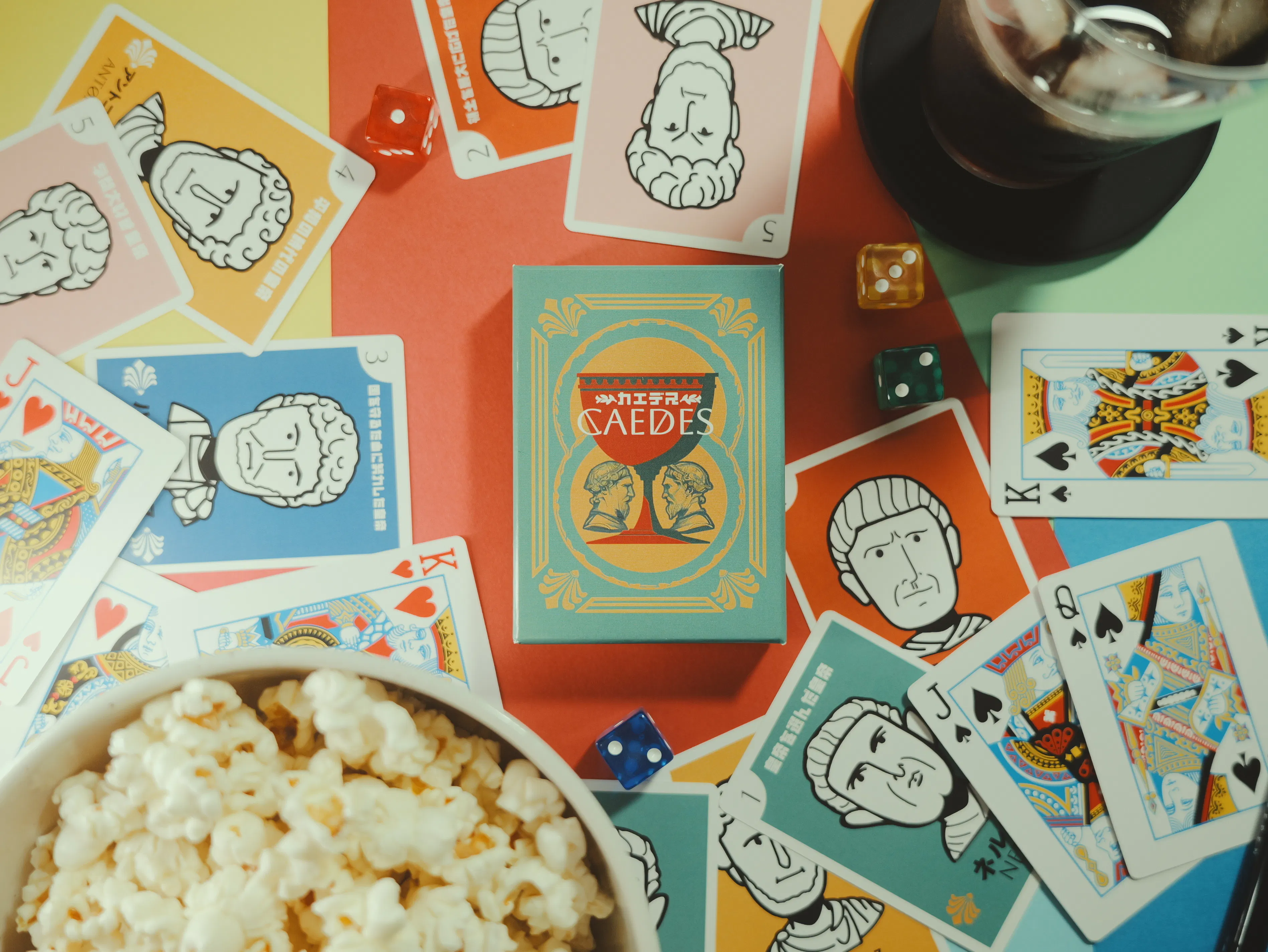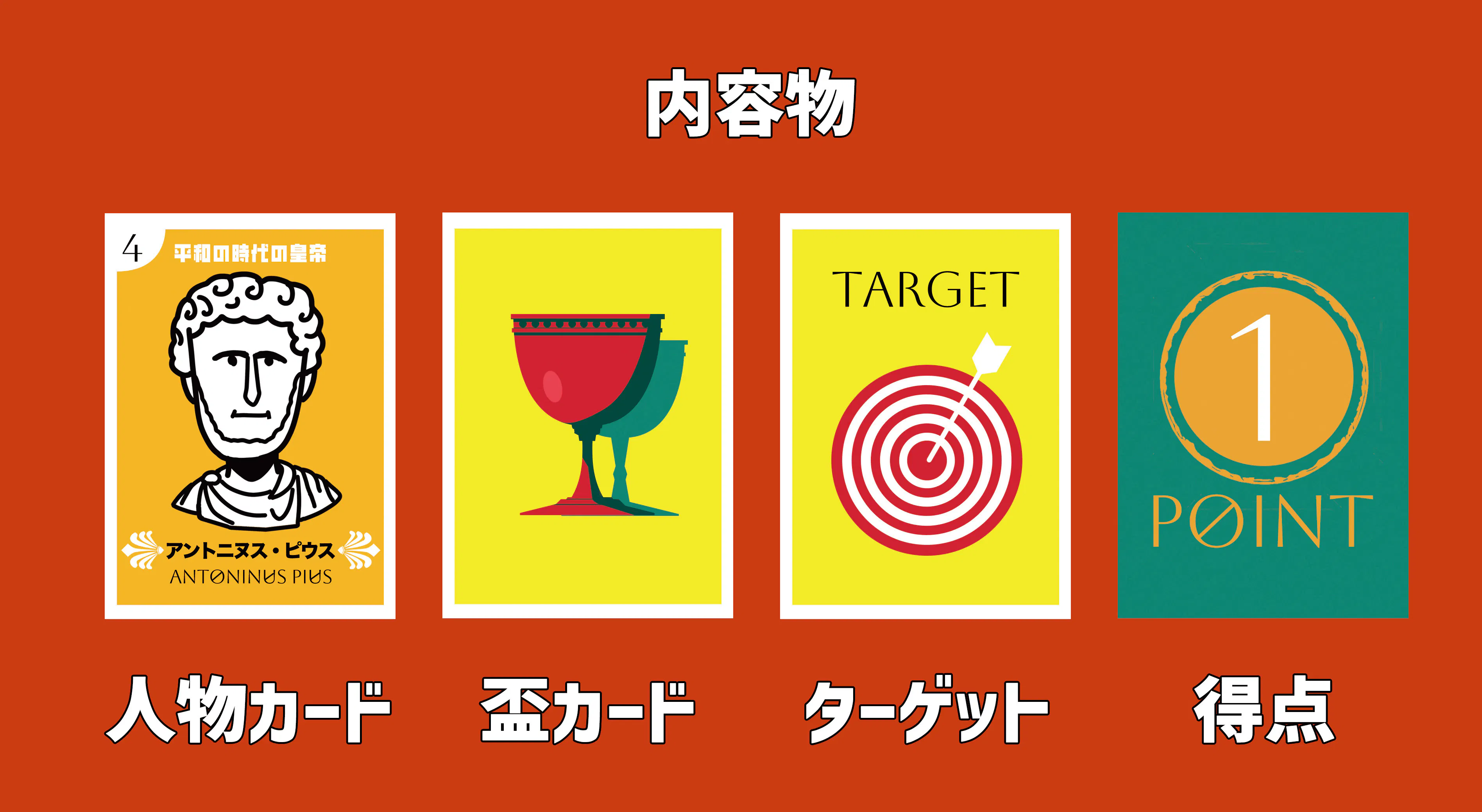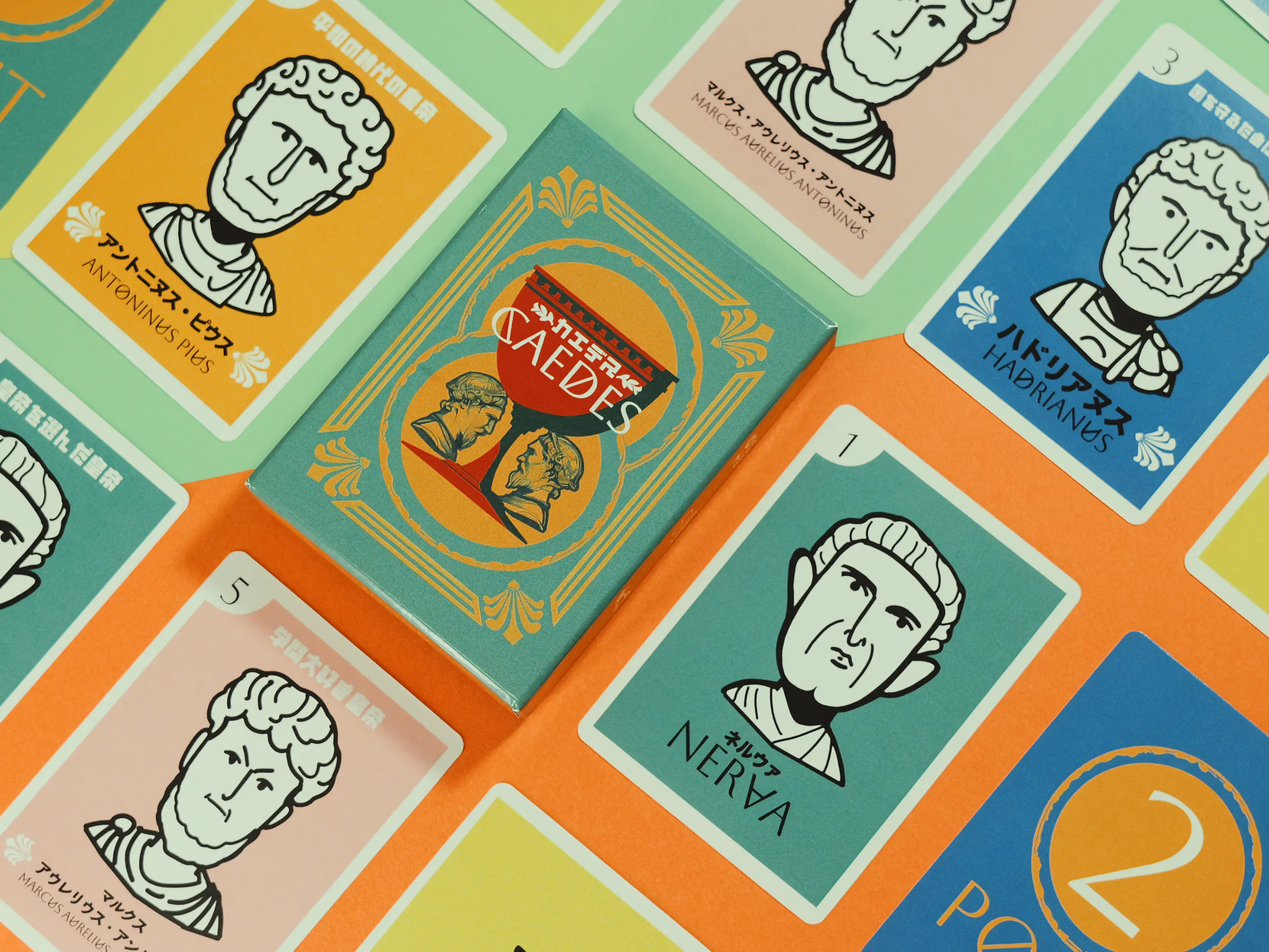 ローマの五賢帝をテーマに、相手の性格を読む心理戦と誰でもすぐ遊べる簡単ルールを融合。
